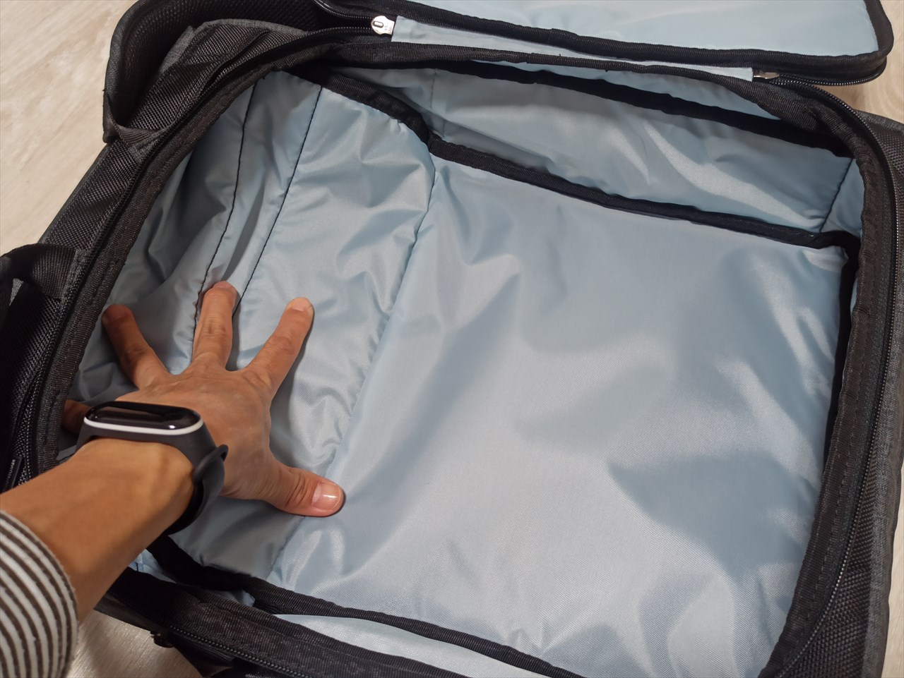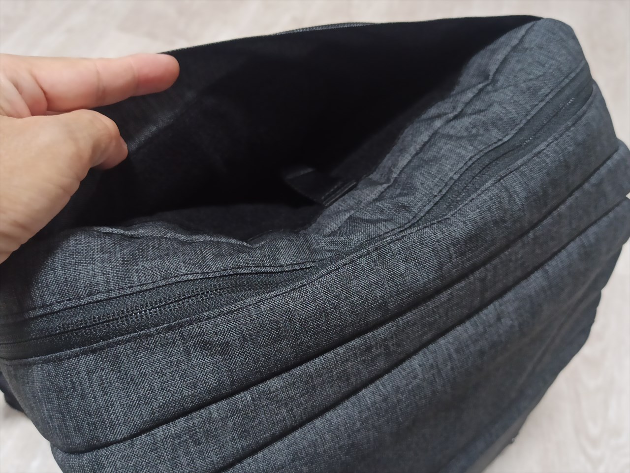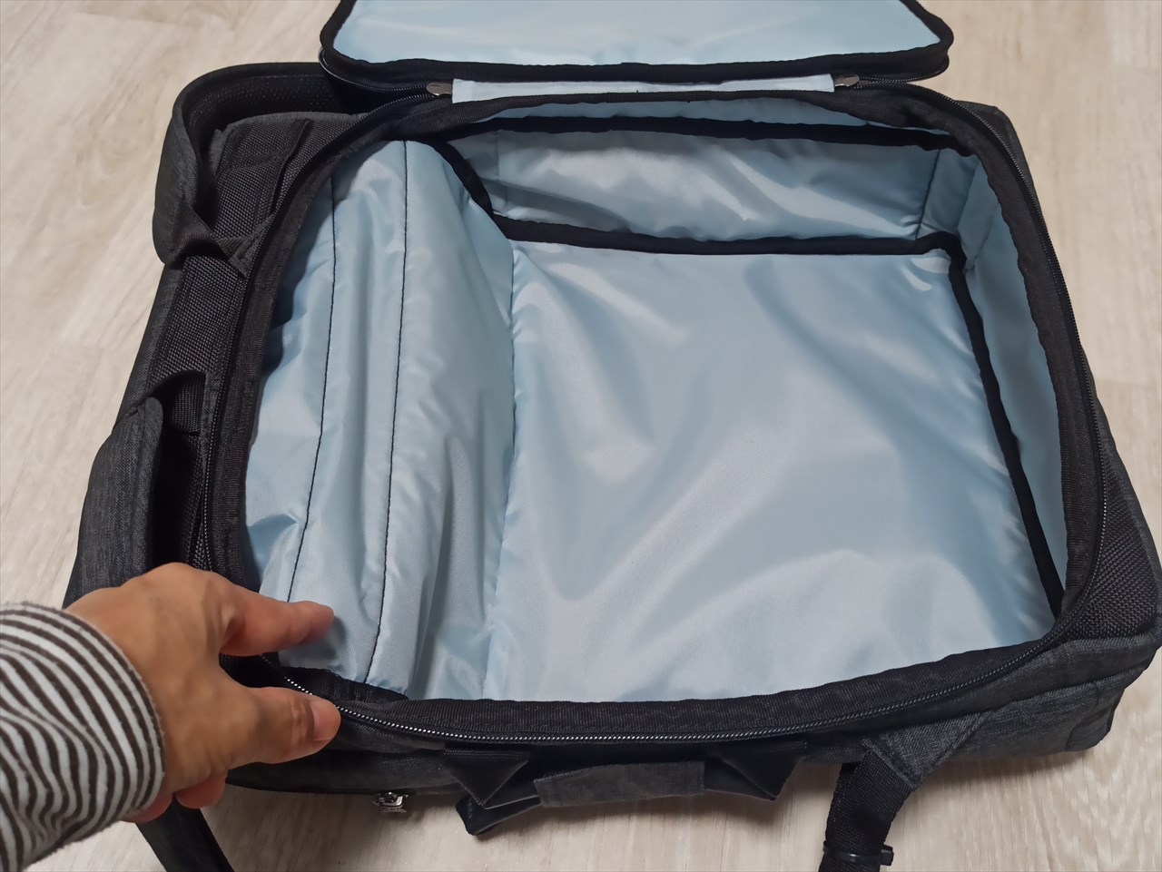 ここへのアクセスはバッグ上部から。ぺらり蓋をめくるとファスナーが現れ、開けるとこんな感じ。