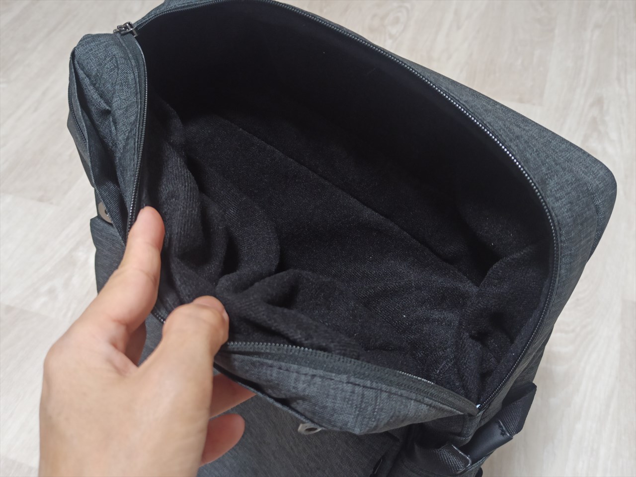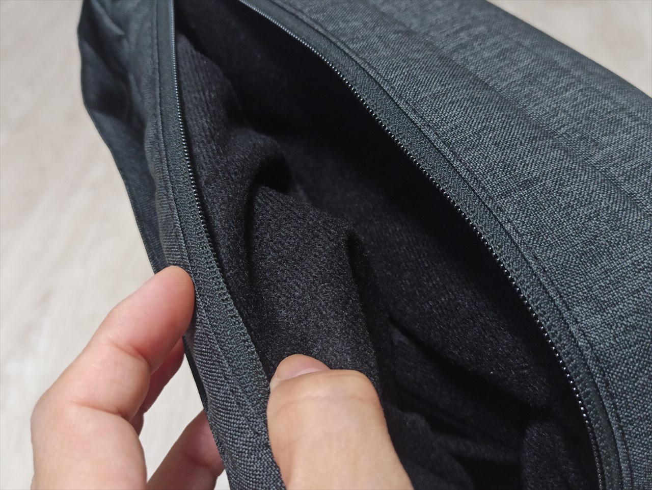 ここはカメラなど精密機器を入れる用途も想定されており、他とはまったく異なる柔らかく毛足もちょっと長めの黒い生地が使われている。ノーマルサイズ版はサイドに開口部があり筒状だったが、今回は上部・片サイドにまたがる長いファスナーでかぱっと開くようになった。