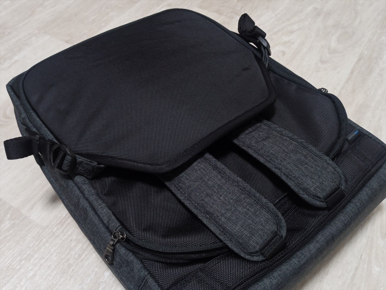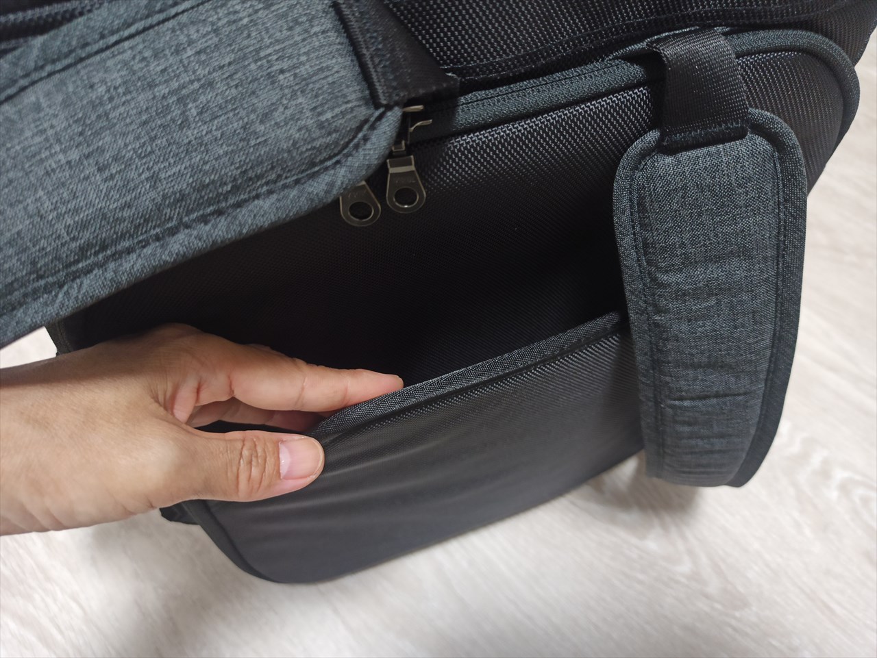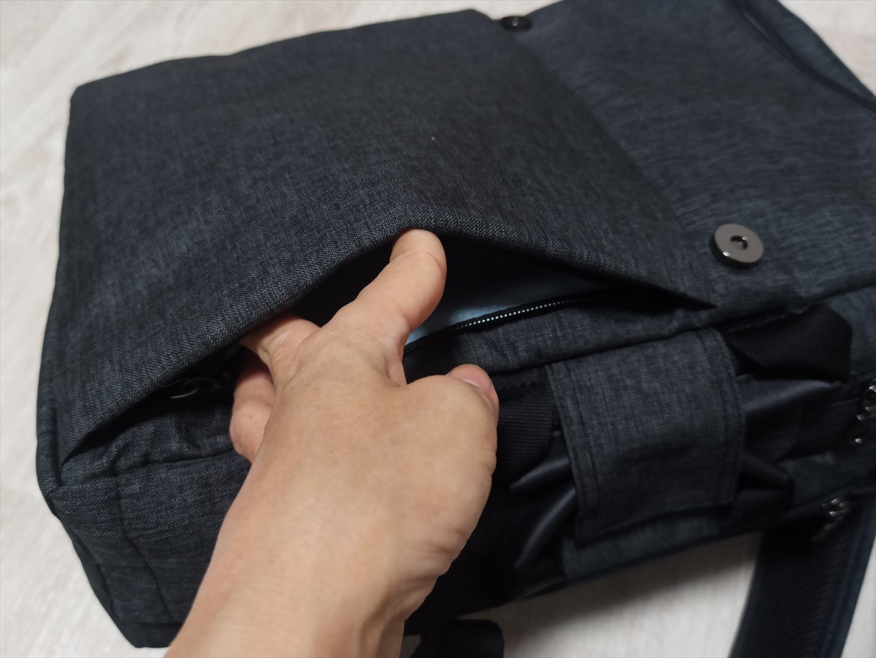 最初見た時「新しい収納部?」と思ってしまったのだが、主目的はショルダーベルトを使わない時の格納庫だった。