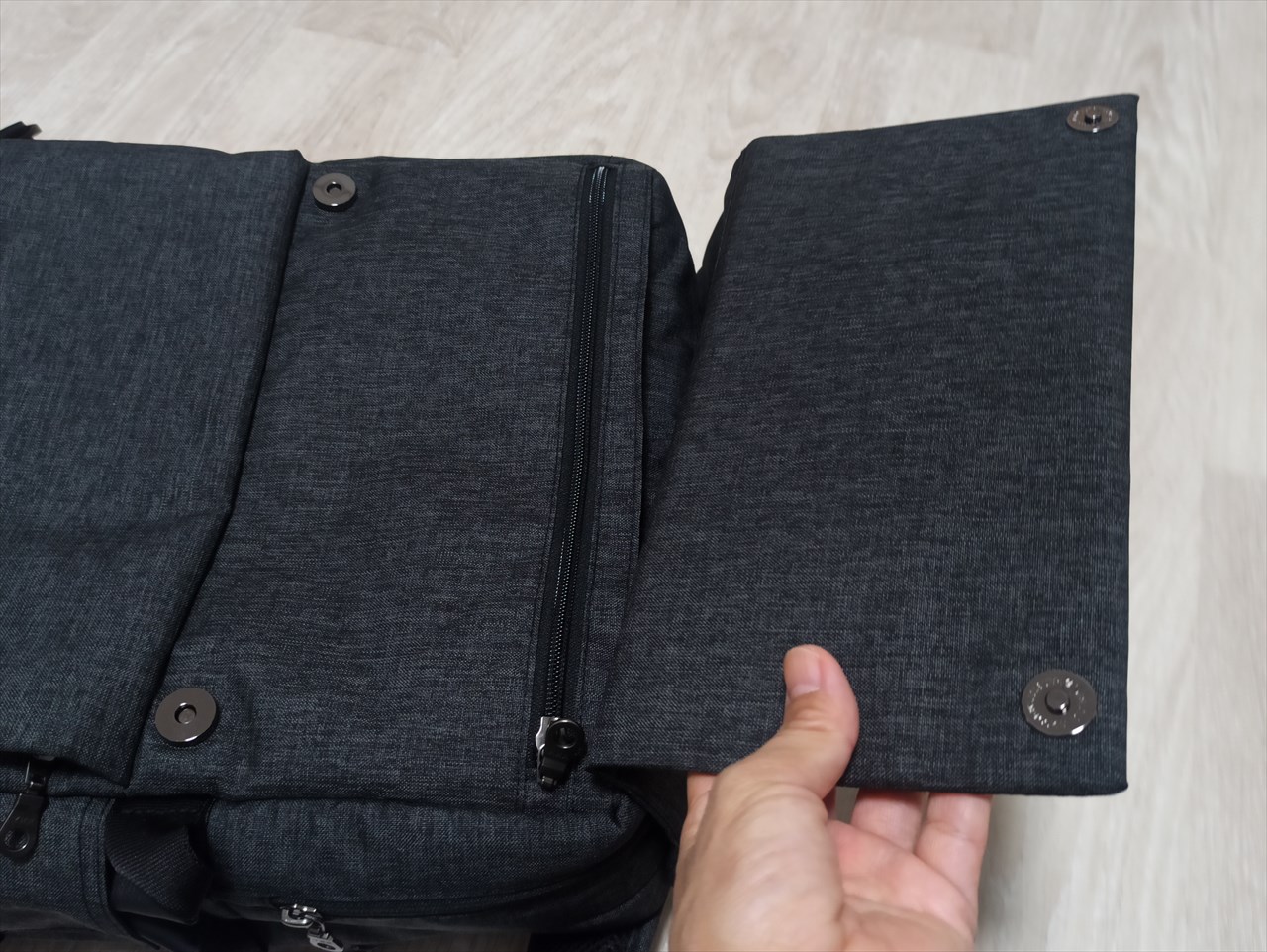 背中開きのメイン気室は、混んでいる電車の中で立ったままものを出し入れするのがちょっと難しいが、そういうシチュエーションで必要なものは自分の場合、読みかけの本くらい。なのでこのポケットがあれば全く不便はない。電車内でリュックを前に抱きかかえている時でも出し入れがしやすい。