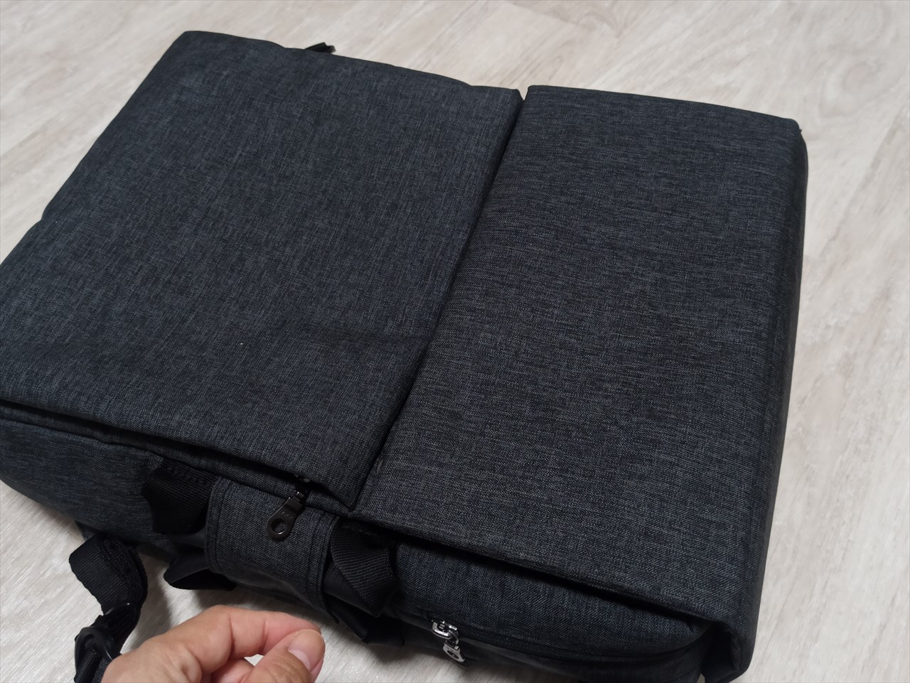 ところがこの「かわるビジネスリュック」は、端正なまでにスクエアな形状で開口部も隠れているため、こうして持てば数秒前までリュックだったことを忘れるほど。