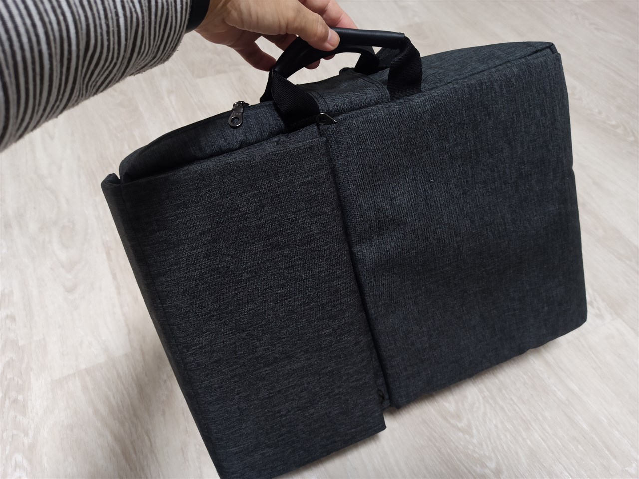背負いスタイルがTPO的にちょっと気まずい場合には、脇に取り付けた取っ手を開放する。
