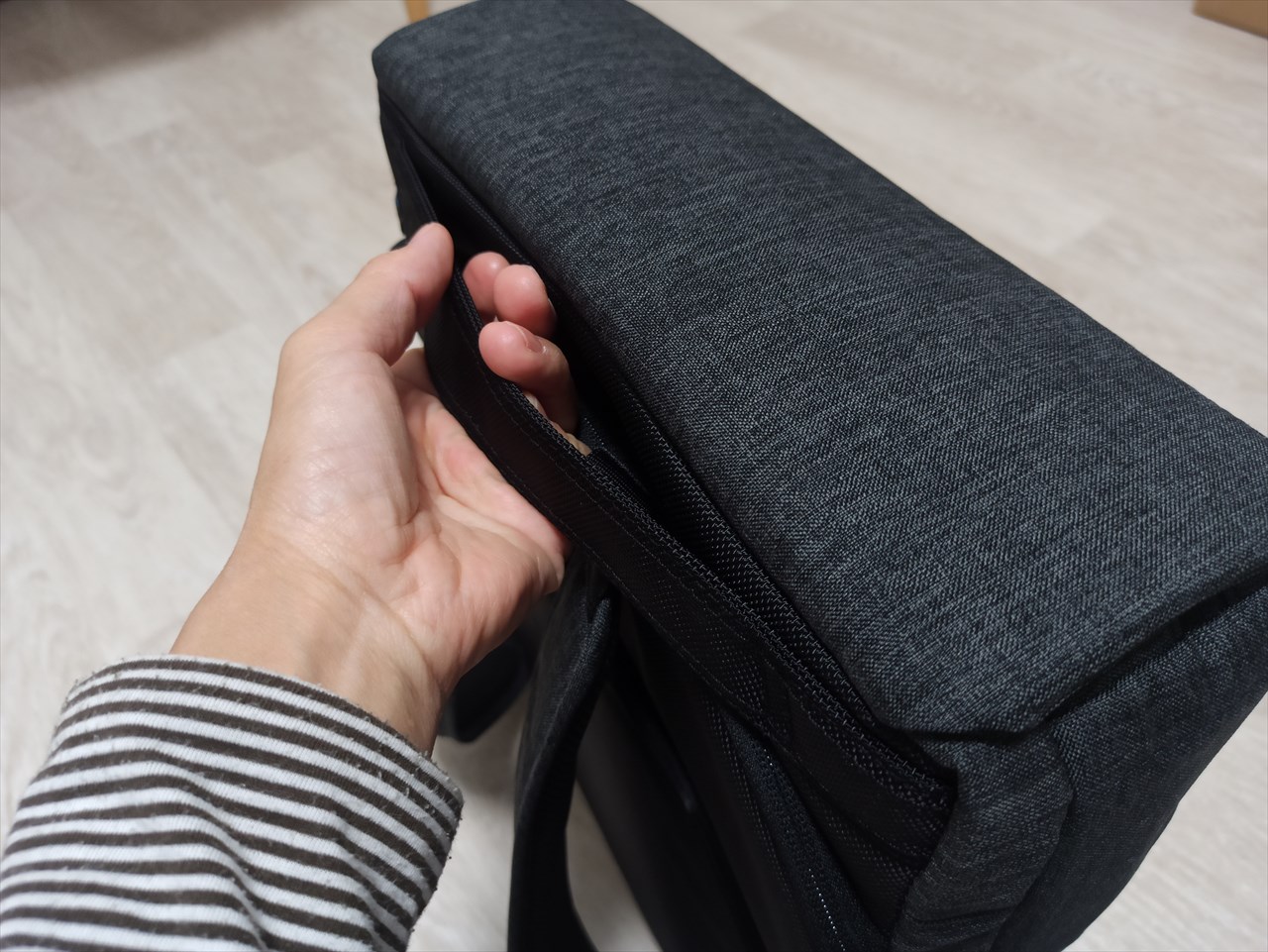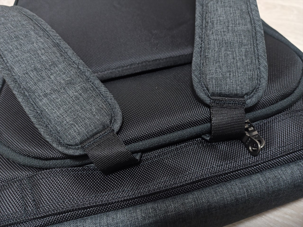 ひらくPCバッグminiにも同じような作りの部分があるのだが、さっと持ち上げる時、ちょっと置き場所を変えたい時などに便利。