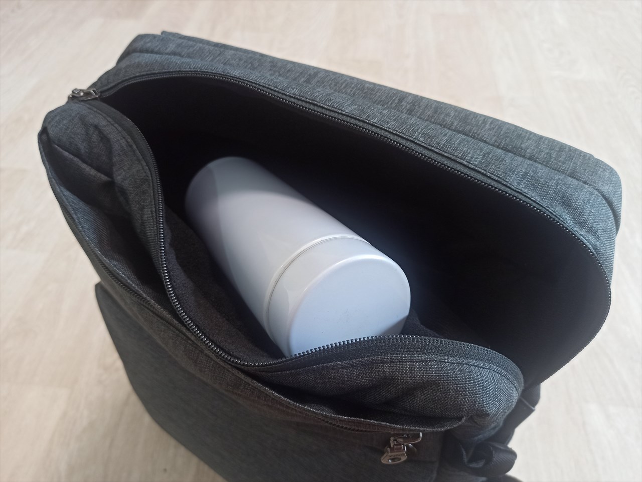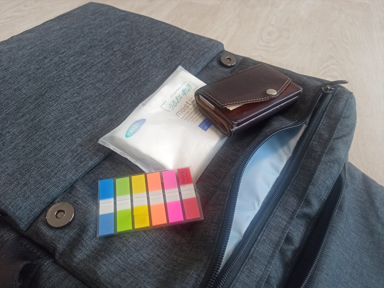 街歩きの途中はファスナー全開にせず中のものを取り出す可能性が高く、となると右肩部分(向き合った状態だと左上)に頻繁に使うものを入れておくといいのかなと。