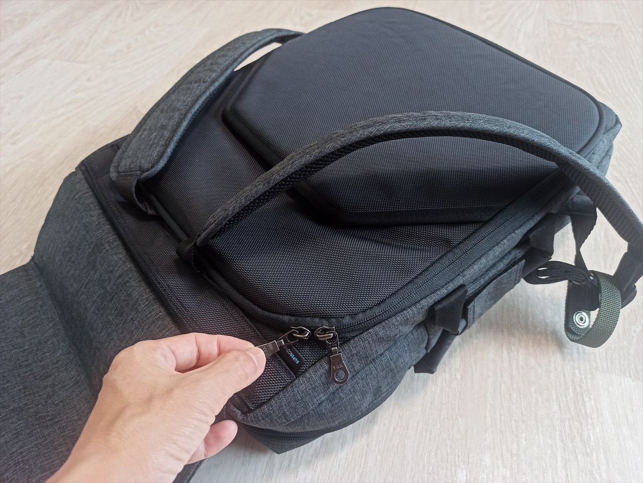 一般的なビジネスリュックは背中側にパソコンを入れるスペースが設けられているけど、長時間背負っているとパソコンにそこそこの負荷もかかってしまうそう。確かに。このポケットなら、よほどリュックをパンパンにしない限り、パソコンを圧迫する力は働かない。