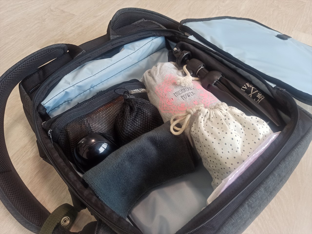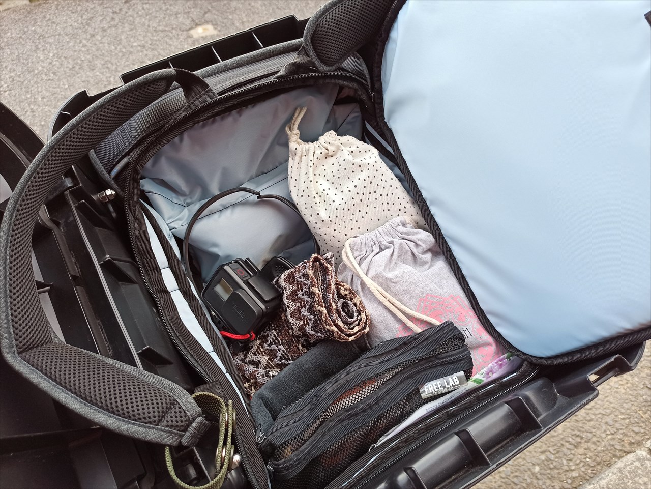 トンネル内を移動しながら撮影するためのアクションカメラやその各種アダプタ、自撮りのためのミニ三脚なども全部背中に入っており、忘れ物で行ったり来たりなんてこともない。