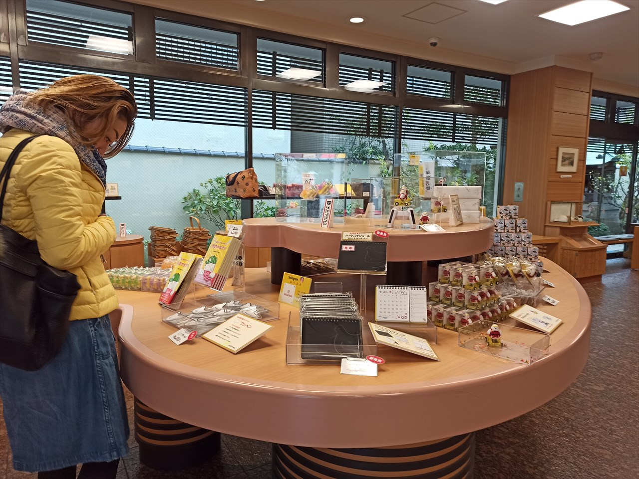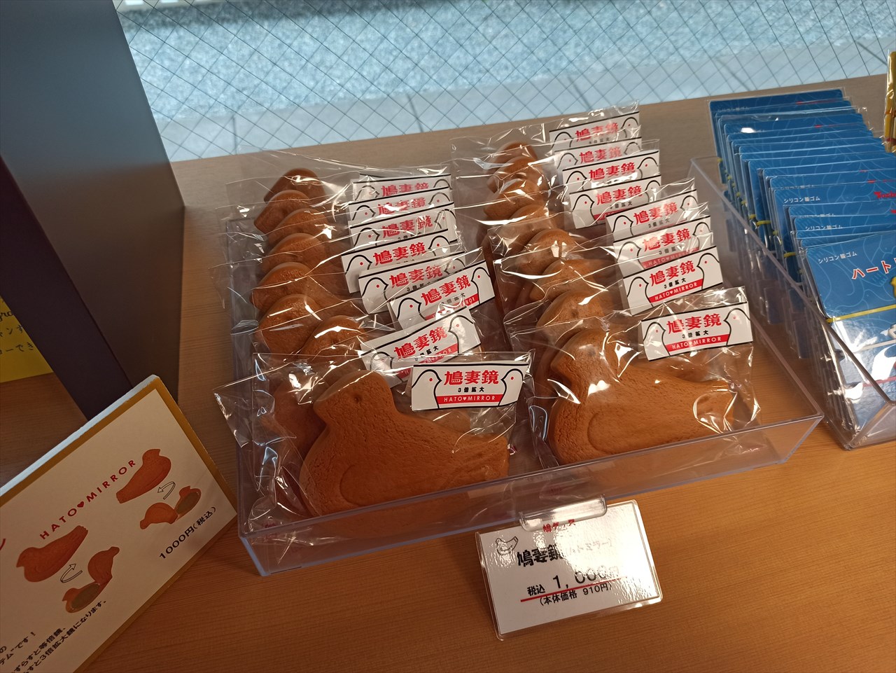 アイデアマンの社長が毎年いろいろ考案して話題の鳩サブレーグッズがいろいろ並んでいる。