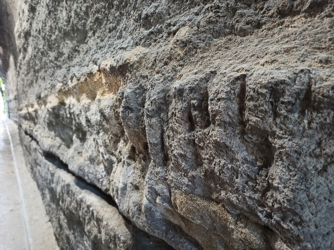 トンネル内の内壁には、おそらく掘削した時のつるはしの跡と思われる溝もたくさん。