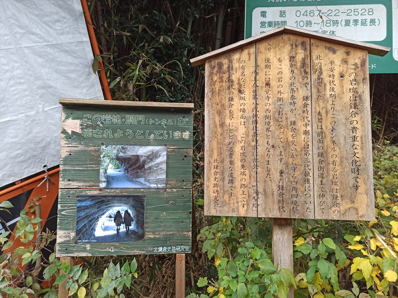 続いてやってきたのは、ニュースなどでも時折登場する北鎌倉駅すぐ裏の素掘りトンネル。ここは4年前に崩落の危険性ありということで通行止めになり、その後、通行再開にむけての工法を巡り、市や地権者、トンネル保護派などが議論を繰り返しているところだ。
