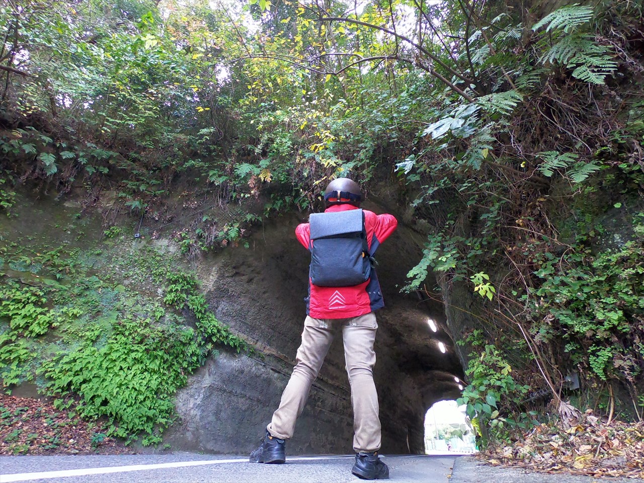 トンネル通行の妨げになってはいけないので、バイクをちょっと離れた路肩が広いところに停め、私はリュックだけ背負って徒歩でトンネル撮影。