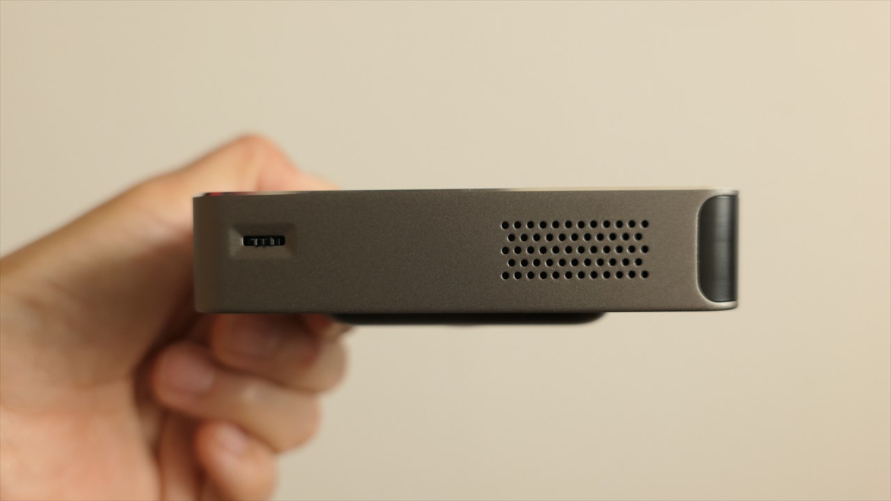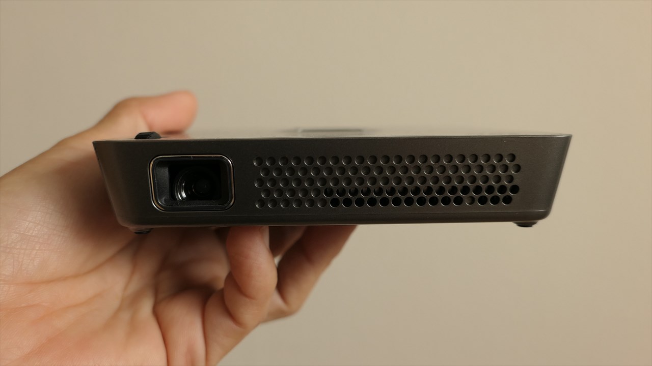 「MP100」よりはひとまわり大きく、手のひらにすっぽりというサイズではないが、プロジェクタとしては十分に小さい。