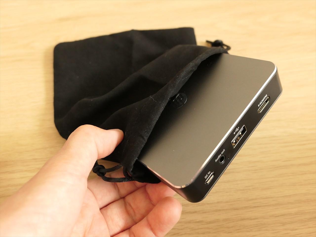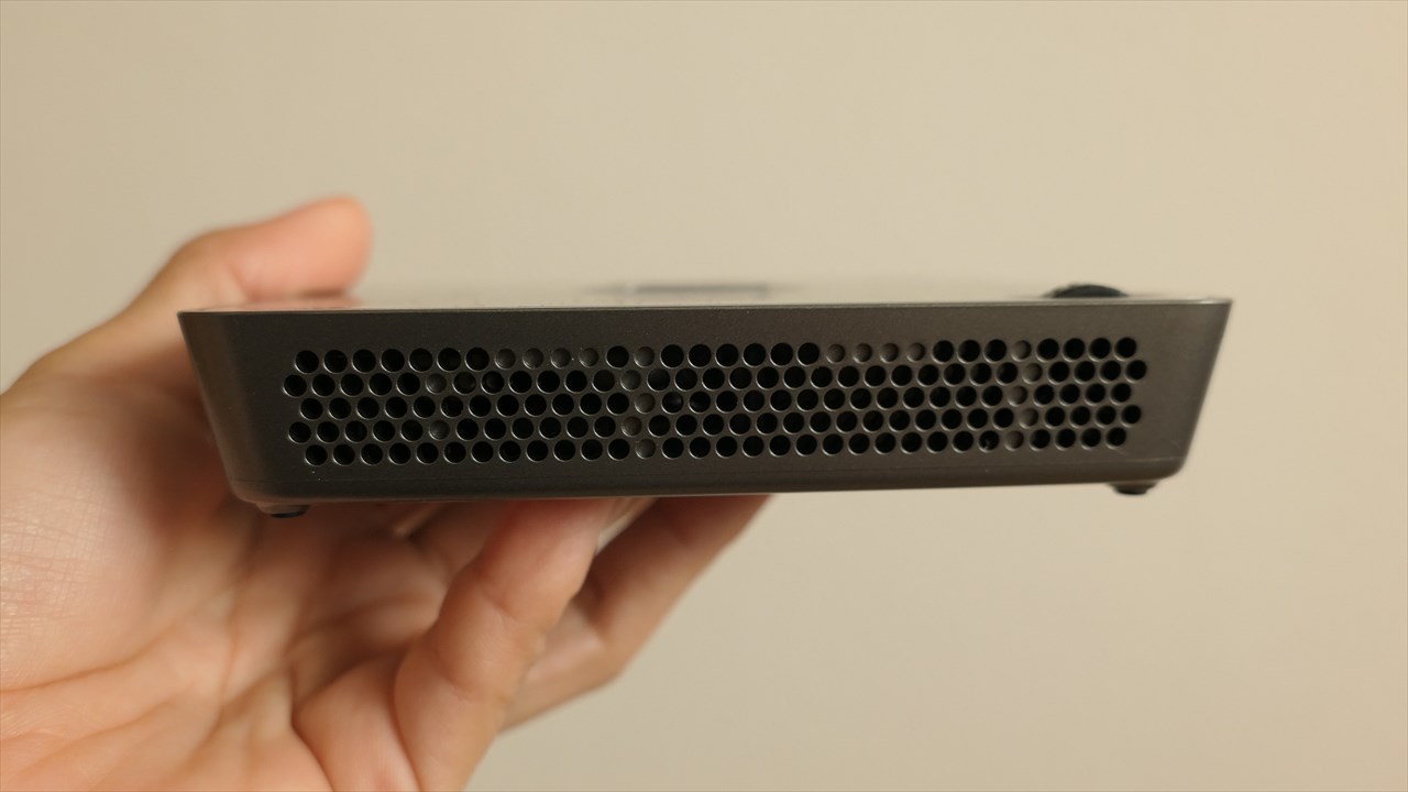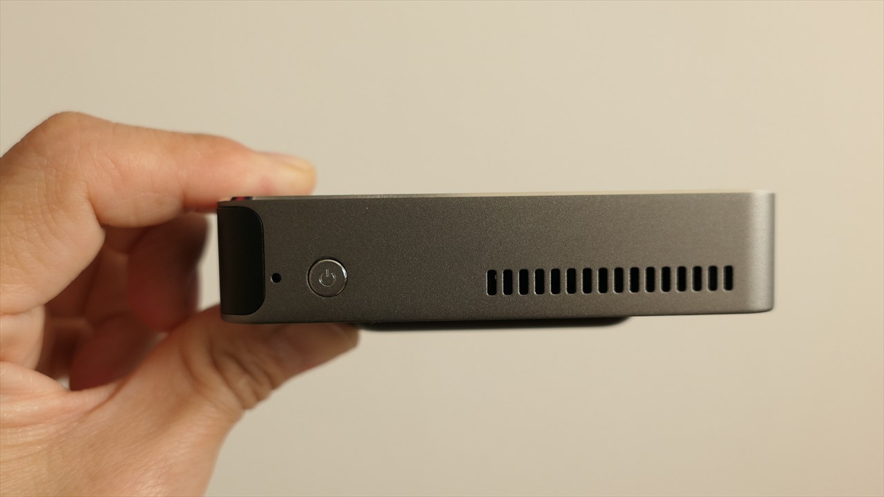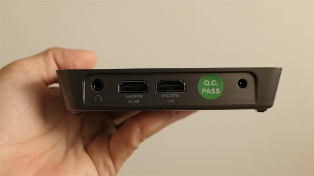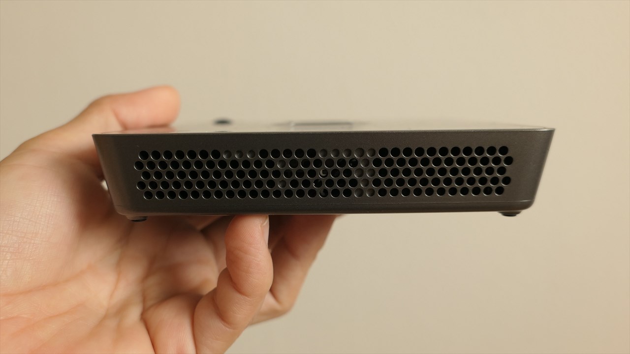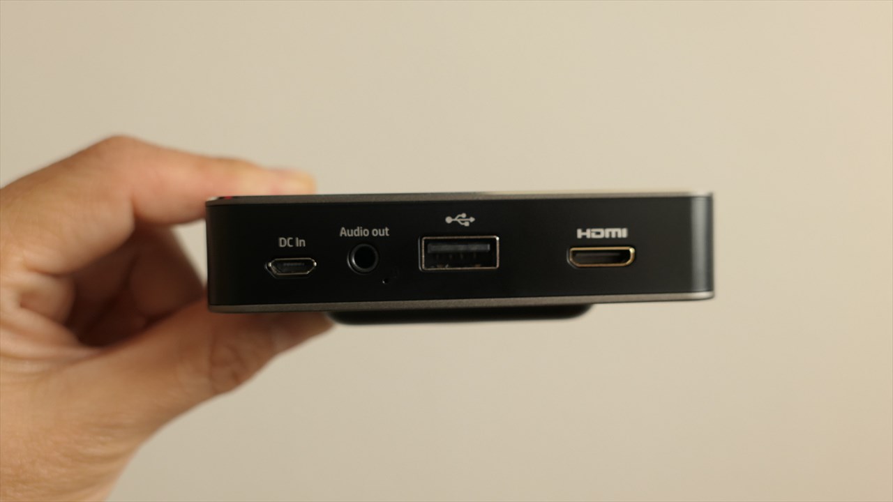 左から3.5mmヘッドフォンジャック、HDMI(アウトプット用)、HDMI(インプット用)、その隣はシールでカバーされているがMicroUSB、一番右が電源アダプタの差込口。公式サイトにMicroUSBの表記はなかったので、製品版ではついていないのかもしれない。→<追記>MP120の製品版にはMicroUSB付いていません。