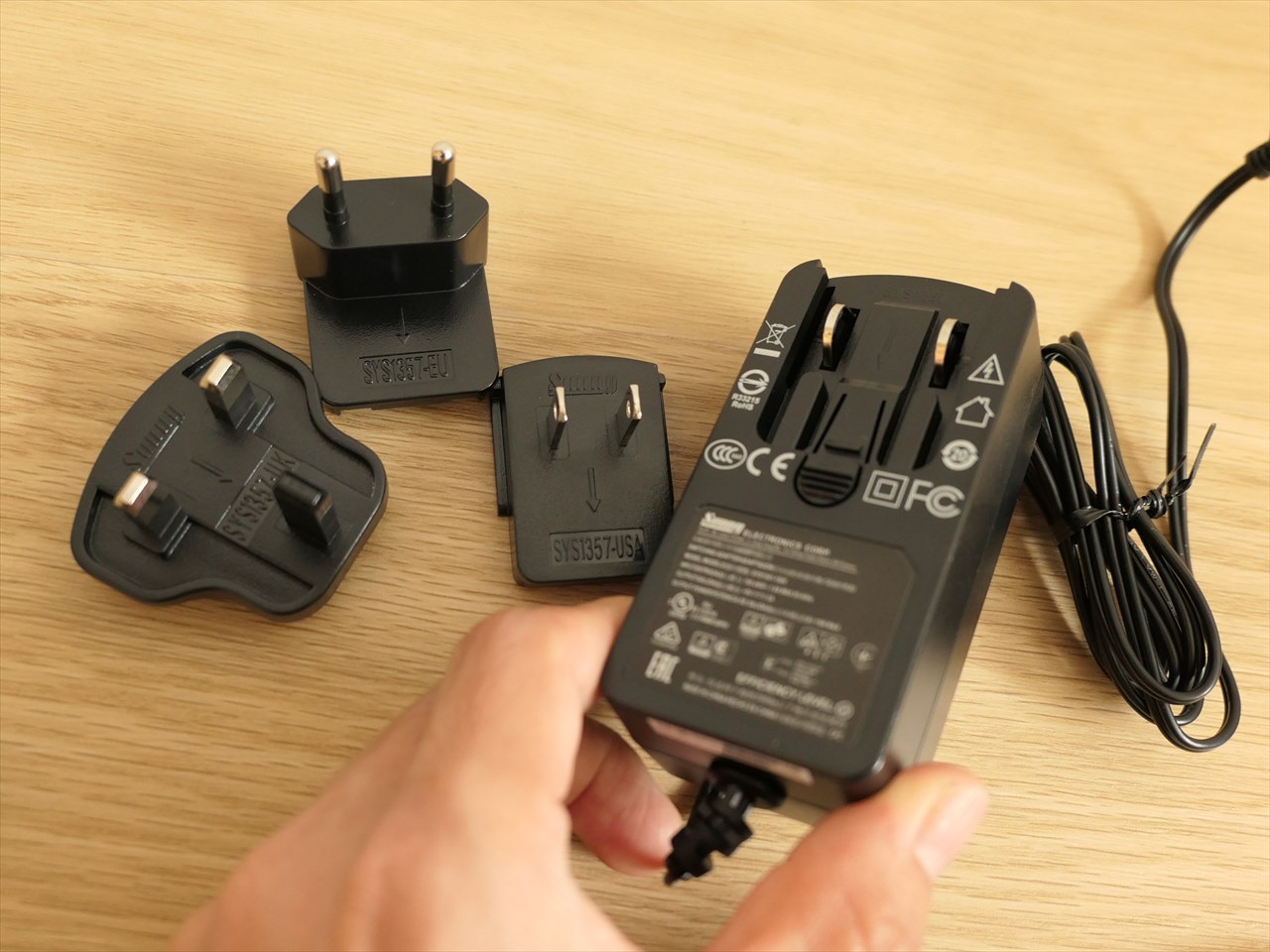電源アダプタはプラグ部分差し換えできるようになっていて、日本で使われている「Aタイプ」の他、「BFタイプ」あとおそらく「Cタイプ」のプラグも用意されていた(製品版でも「Aタイプ」以外が同梱されるかどうかは未確認)。→<追記>日本で発売される製品に同梱されているのは日本国内用「Aタイプ」のACアダプタのみで、海外用差し替えプラグは同梱されません。