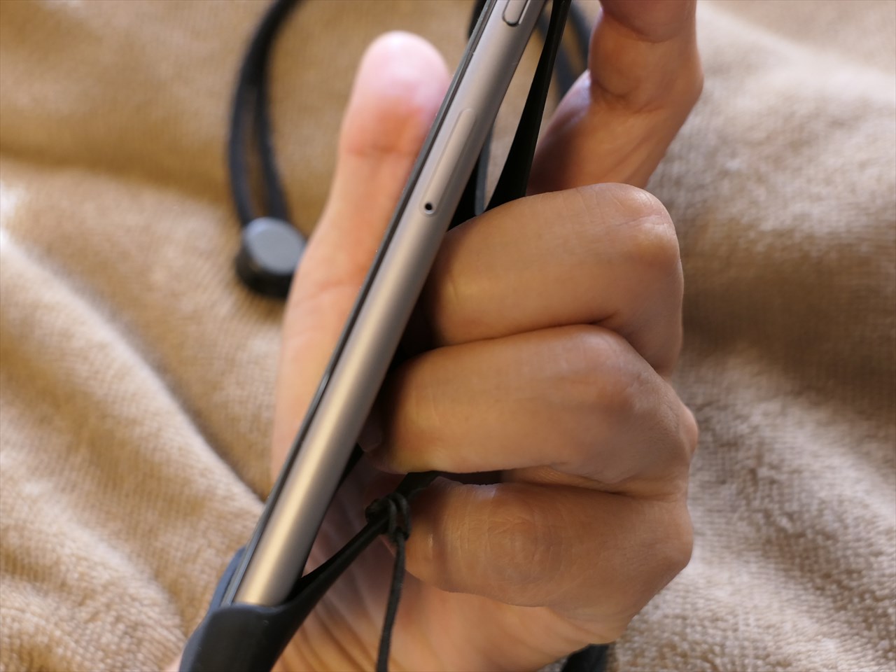 長期使っていると、シリコンとはいえやや伸びるらしいので、その場合には脱落のリスクがあるかもしれないが、使い始めの今時点でいえば、この状態でストラップを首にかけていても、特にiPhoneの自重で落ちてしまうようなことはなさそうだ。