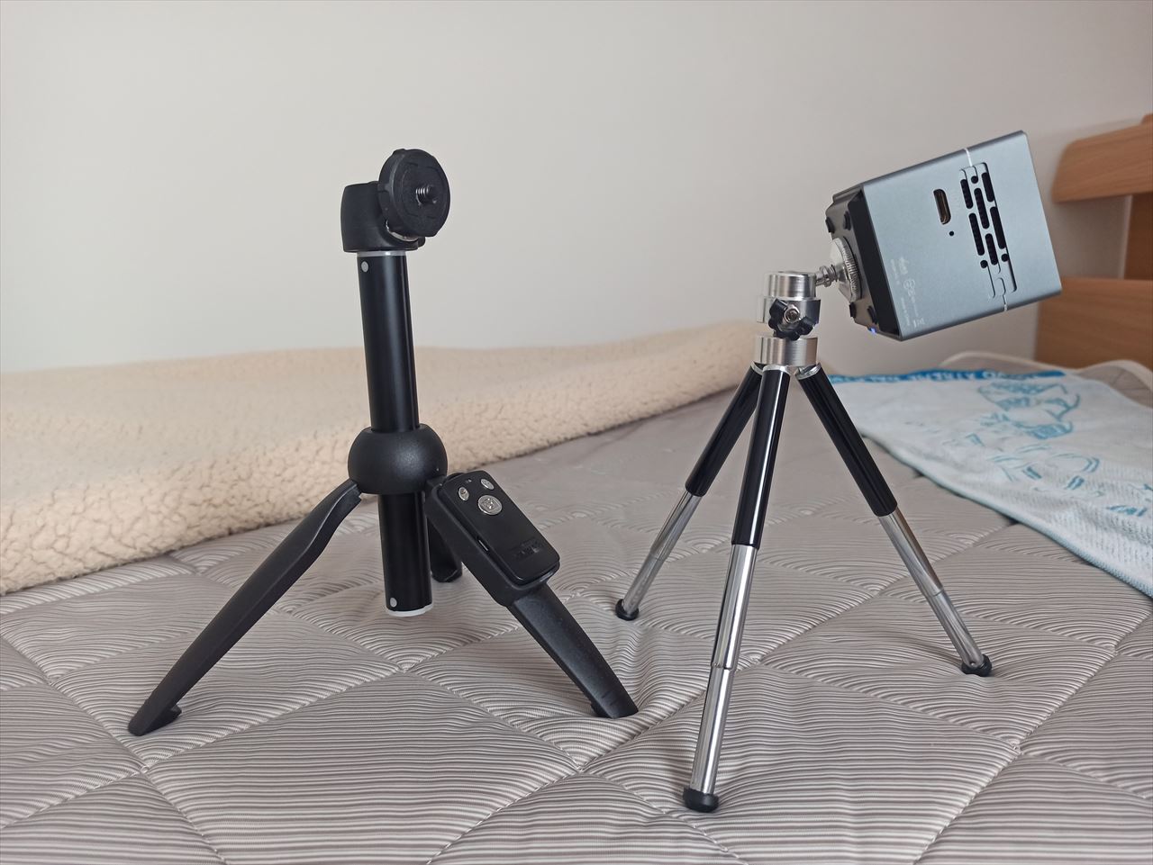 自分はエンドレスになるのが怖くて、ベッド上では内蔵バッテリーだけで観ているが、2時間以上利用したいということなら、三脚を使って給電しながら投影すればいいだろう。付属三脚で安定感が不安なら、Amazonで千円台で頑丈なものが売られている。