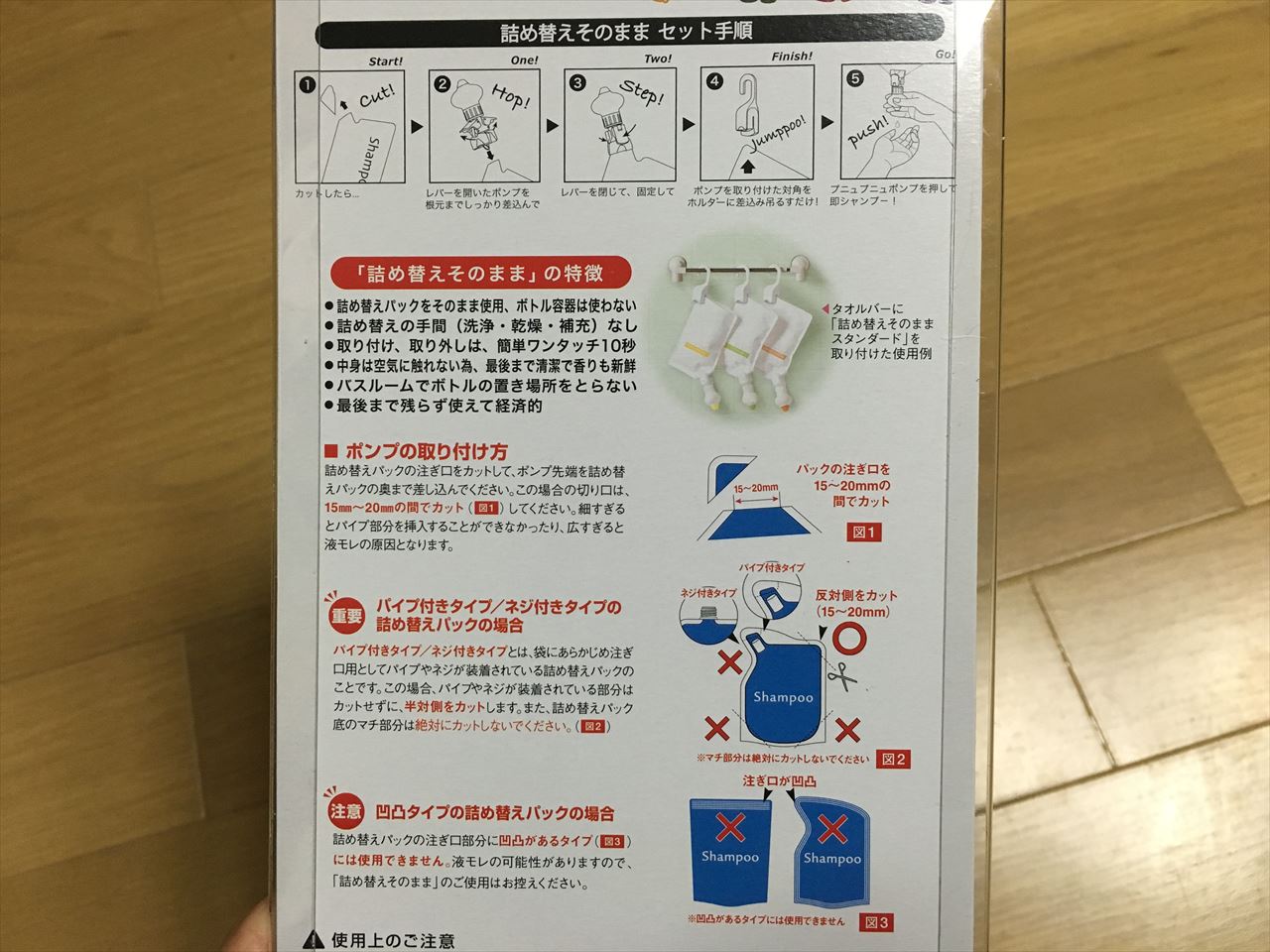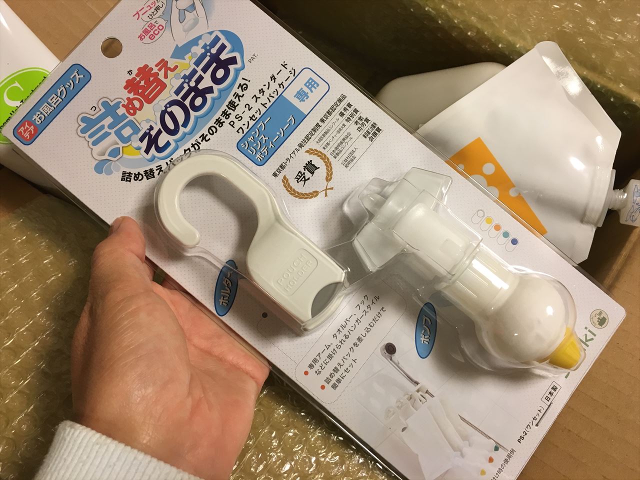 詰め替え用シャンプーやボディーソープを吊るしてそのまま使うためのアイディアグッズ「詰め替えそのまま」