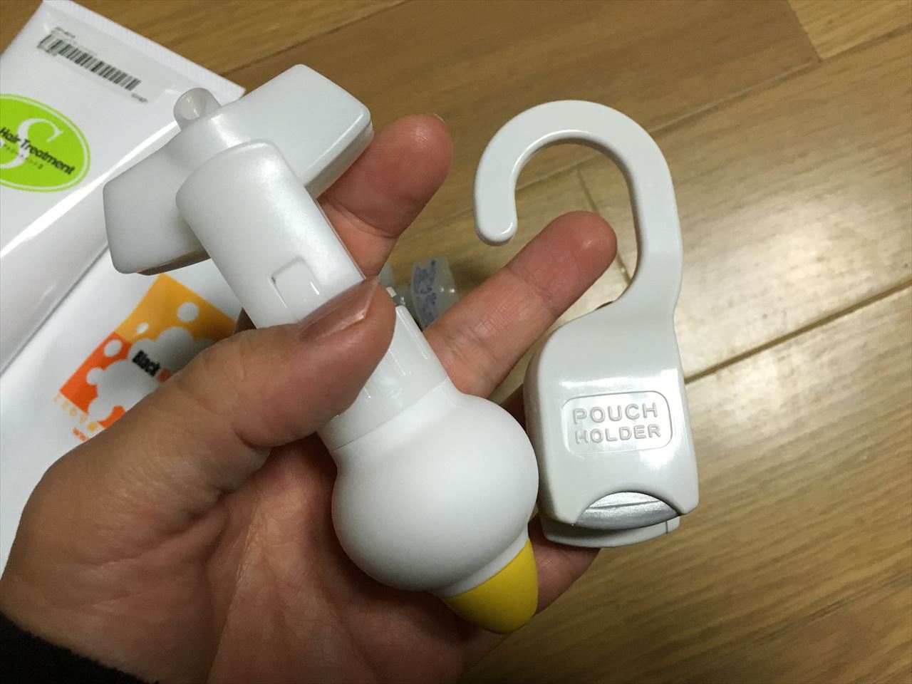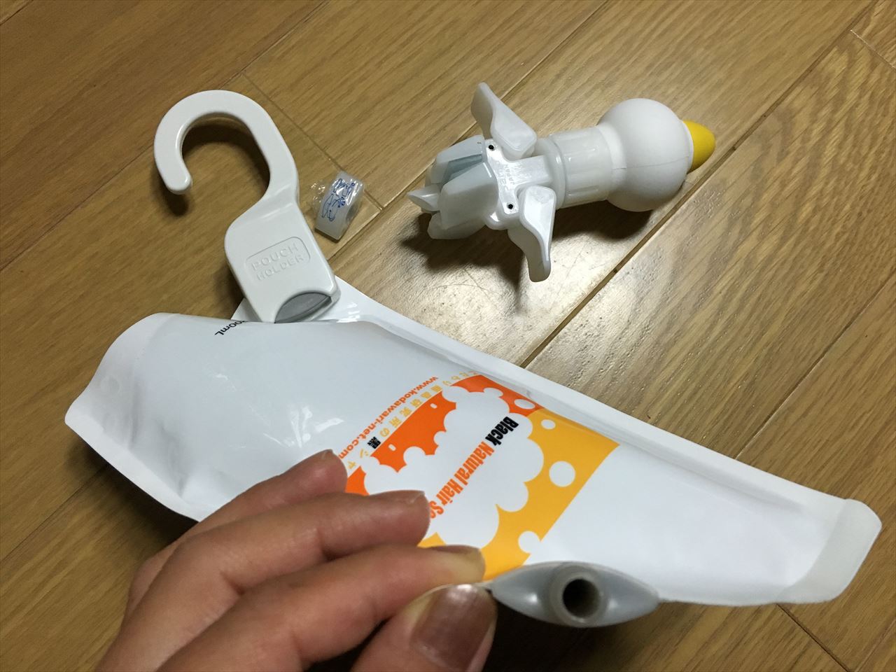 ↑こんな感じで、詰め替え用ビニールパックのシャンプーやボディーソープを、詰め替えずに吊るして使うためのアイテムだ。