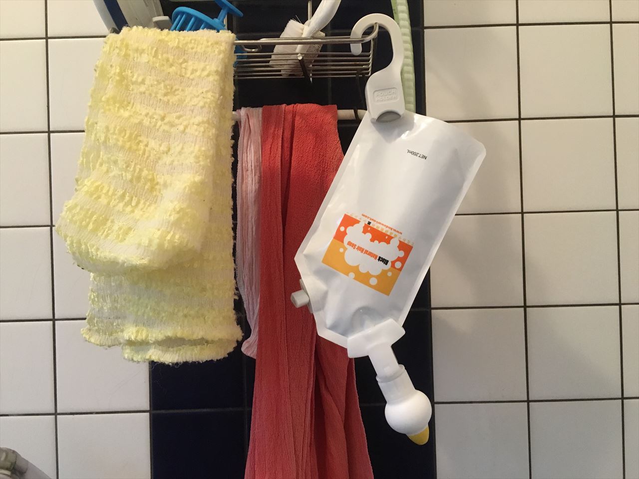 今はシャンプーだけだが、ボディーソープやリンスも同じ方式にするなら、別途タオル掛けをもうひとつ取り付けたほうがいいだろう。