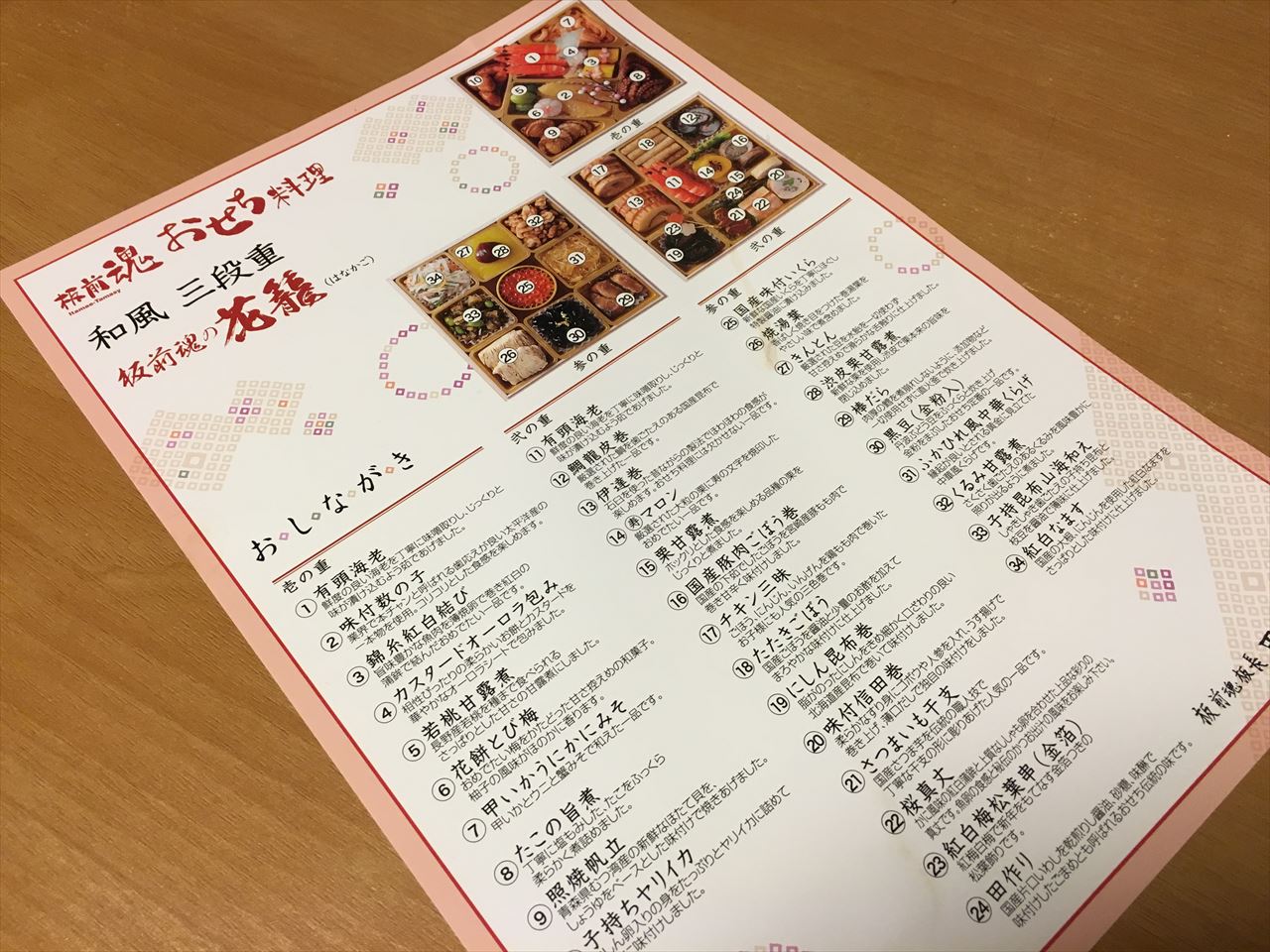 年末に家族の入院などもあり、おせち料理をお取り寄せすることになった。悩んだ末に決めたのは楽天市場のおせちで毎年人気上位にあがる「板前魂」の和風三段重「花籠」。量的にさほど多くなく値段もお手頃、さらに重箱ではなく白木の箱に入ってくるのがいいかなと思ったのが決め手。