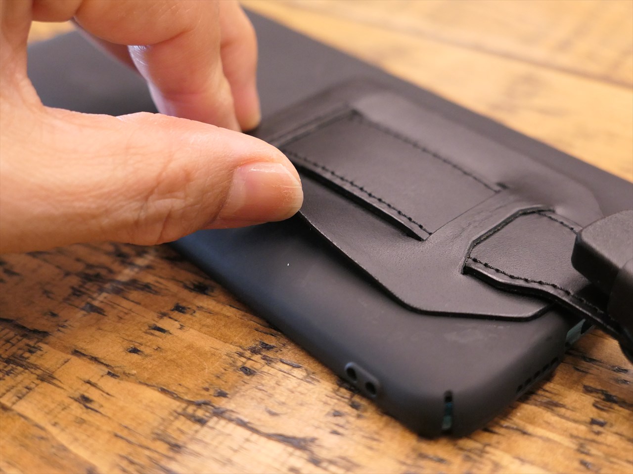 スマホ(スマホケース)に貼り付けた側は革製で、中央のバンド部分に指を差し込んでリングのように使うことができる。必要ない時にはぺたんとフラットにしておける。これが実はすごく便利。