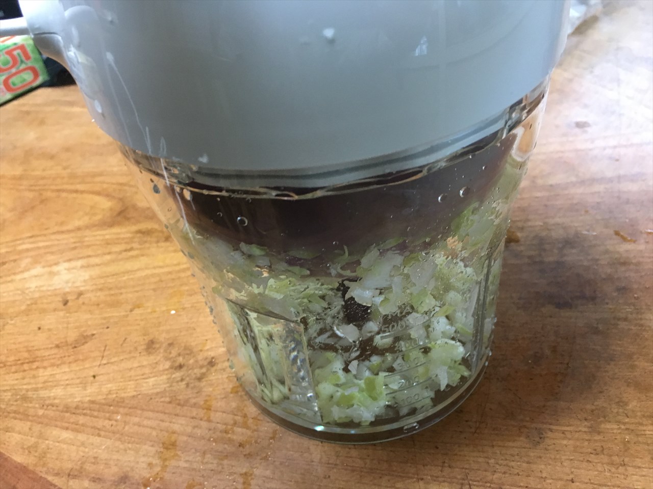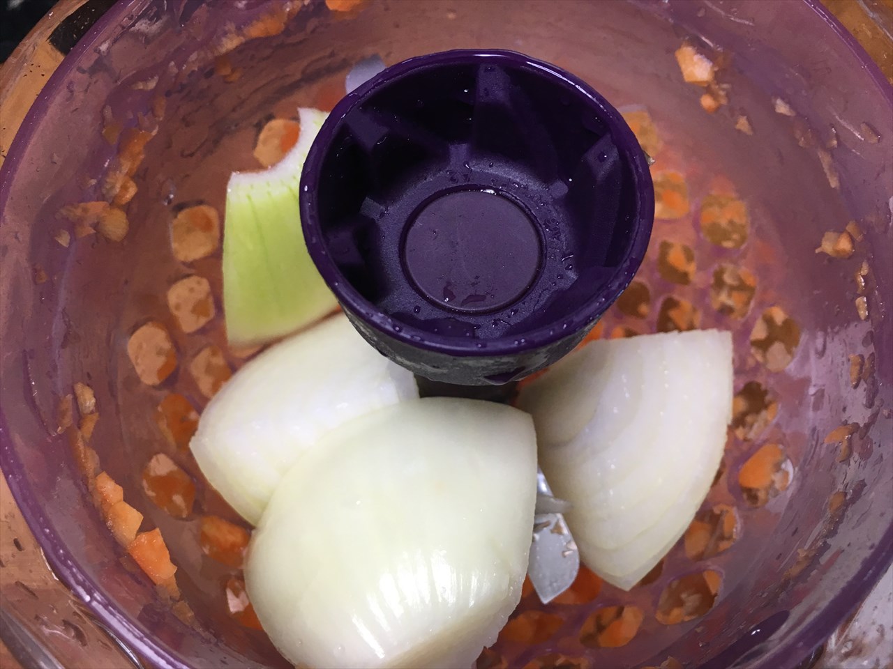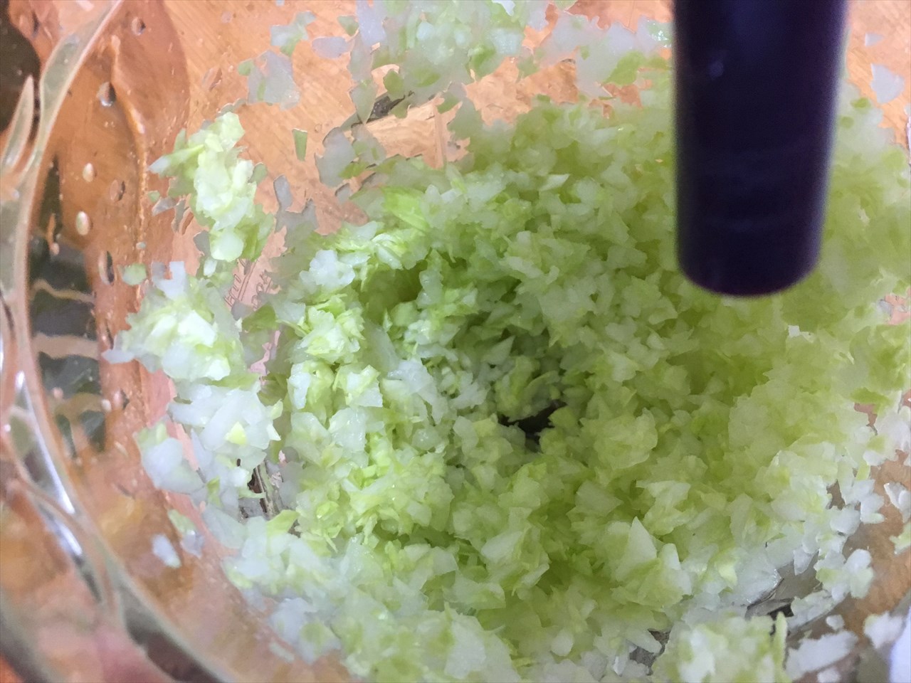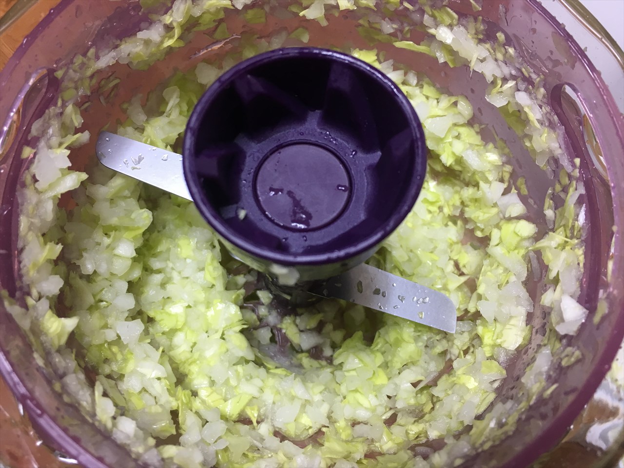実を言うと初めてだったためによくわからず、ちょっと入れ過ぎてしまったようだ。玉ねぎ、大根、キャベツと順番にカットして、ボールか何かで混ぜ合わせたほうがよかった。1人分なら一度にやってもよかったろうが、4人分を一度にやろうとしてしまったので。