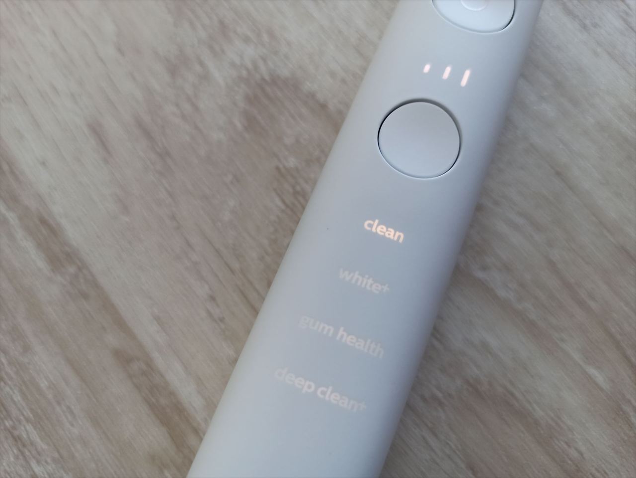 待機状態(振動していない状態)で押すとモード変更となり、ブラッシング状態(振動している状態)で押すと強さが変化する。
