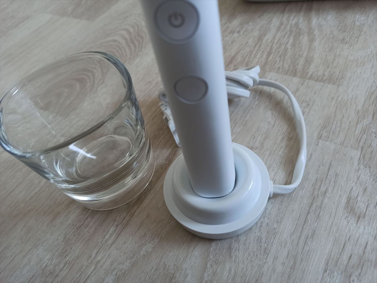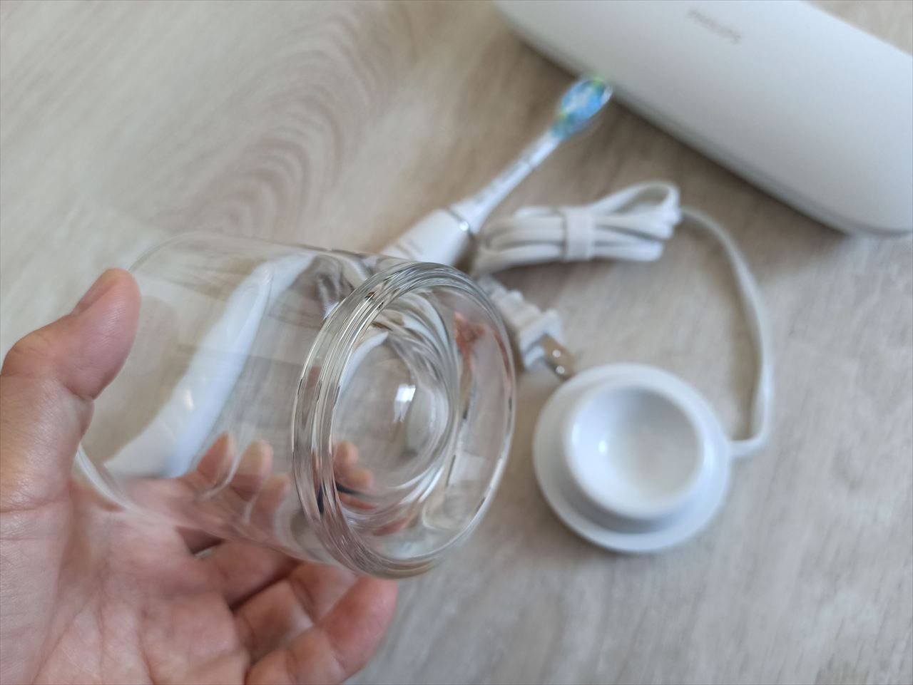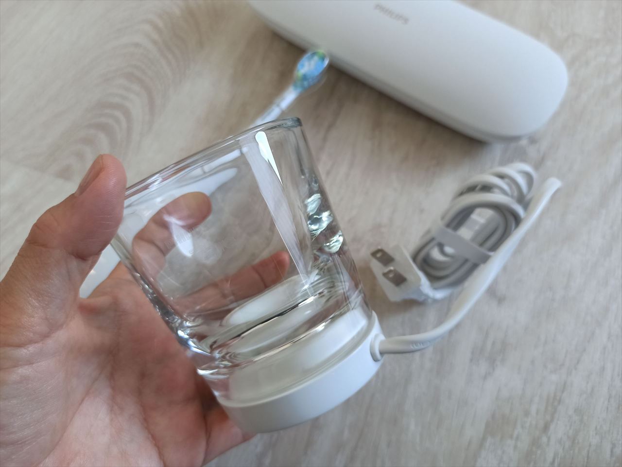 普段は歯磨きの際に口をすすぐためのコップとして利用し、充電する時だけ底に充電器をセットすればいいという仕組みだ。