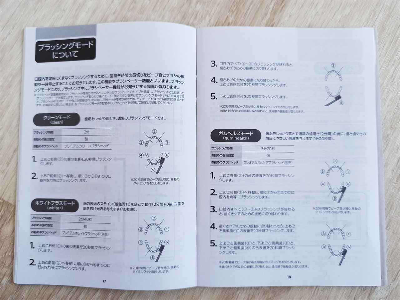 ソニッケアでは、磨くエリアを変えるための合図(ビープ音とブラシ振動の一時停止)があるのだが、モードを変えることでトータルの時間も変わり、途中のビープ音の回数も変わる。基本的には20秒ごとに移動してゆく方式のようだ。