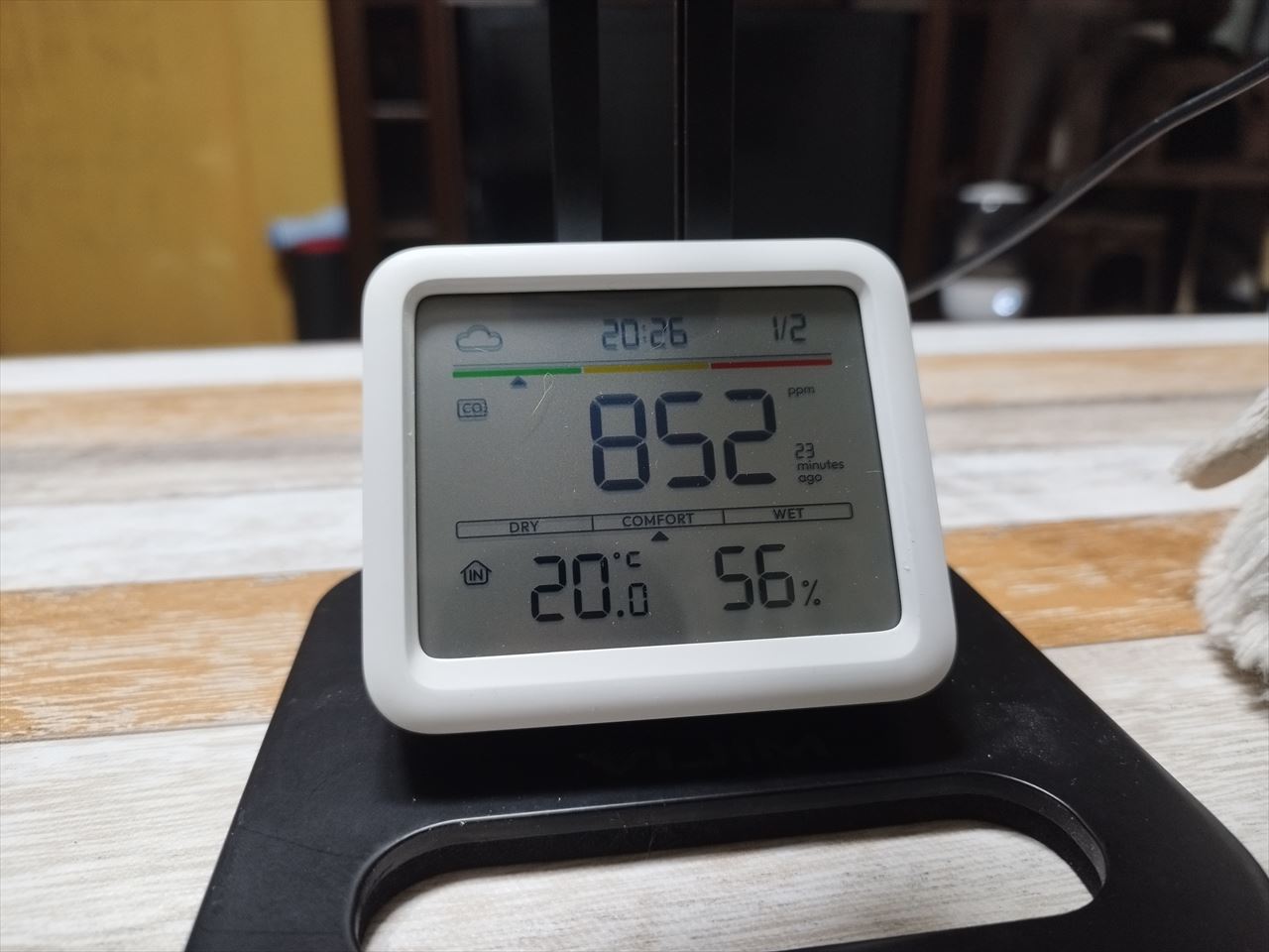 そのパソコンのディスプレイスタンドの足下にCO2センサーを置いている。