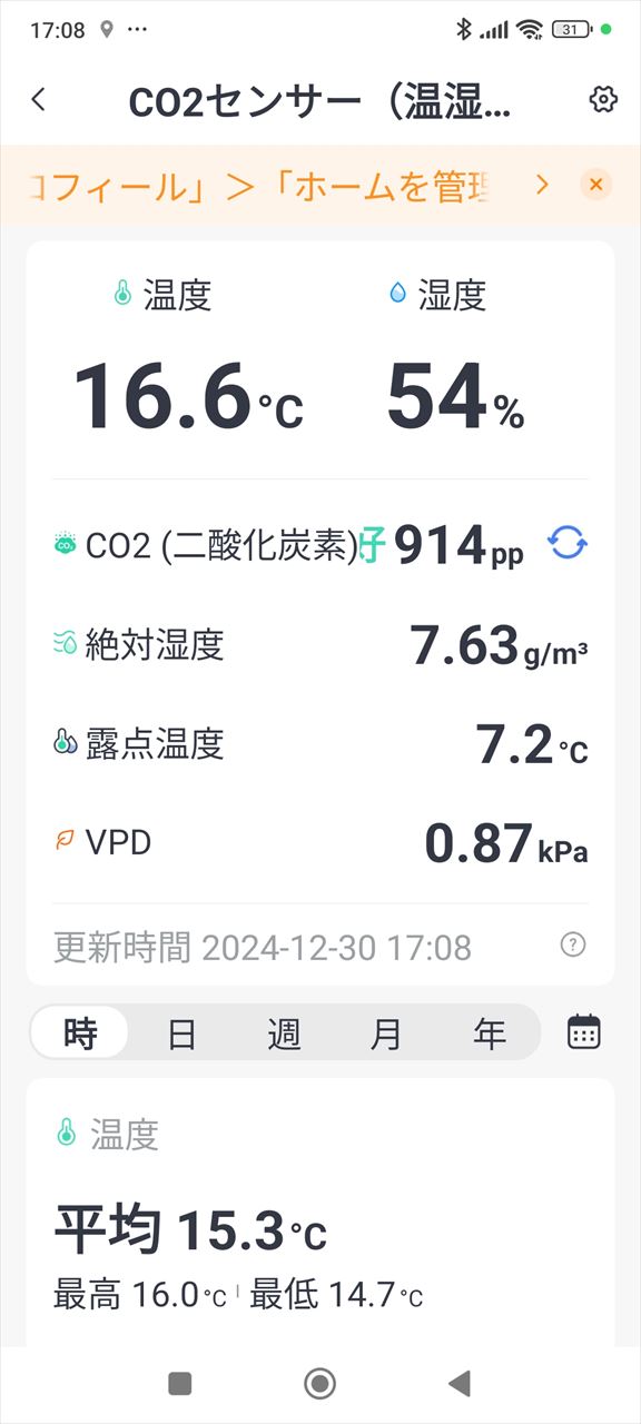 今いる部屋は10畳だから、一人だけなら1,000ppmを越えることはまずないと思うけど、今まで6畳の閉め切った部屋にこもっていた時には、実はCO2濃度が基準値を超えていたのかも。
