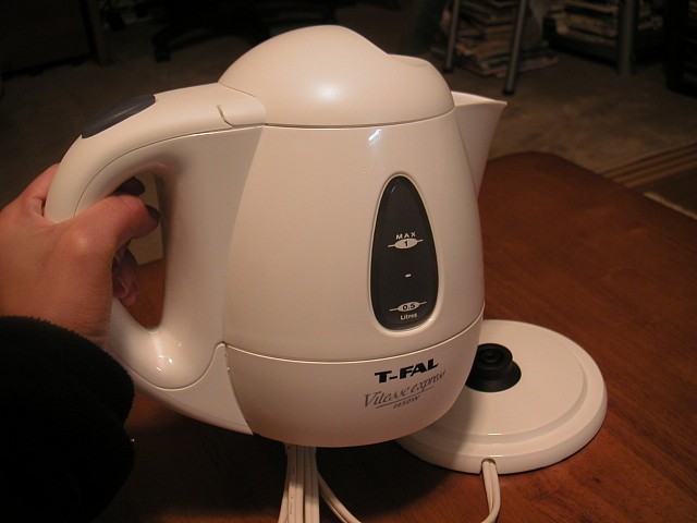 面白いのは、ポット自体には電源コードがついていないこと。下の丸い円盤状のものに電源コードがついており、置けば通電する仕組み。コードレスってキモチいいんだよね。(←ワイヤレス化マニアなもんで)