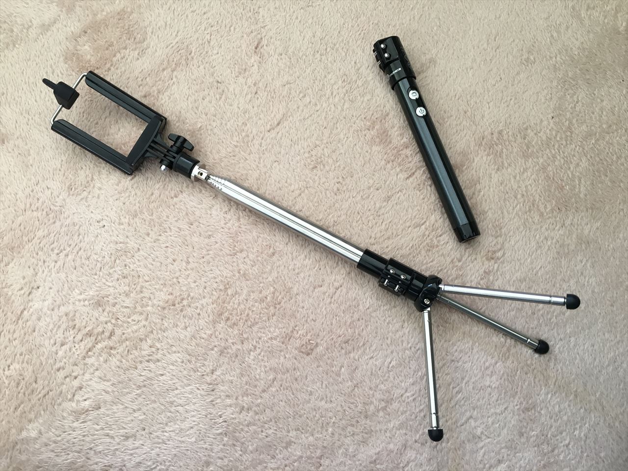 普通の自撮り棒と違うのは、Bluetoothコントローラーをはずし、三脚アダプタを取り付けると、三脚になること。