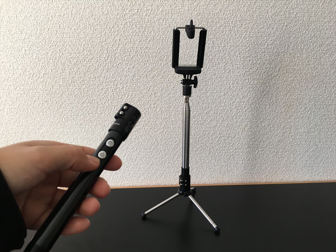 もしくは机の上に置いたり、三脚の上に立てて遠方からスマホアプリで撮影ボタンを押す必要がある。