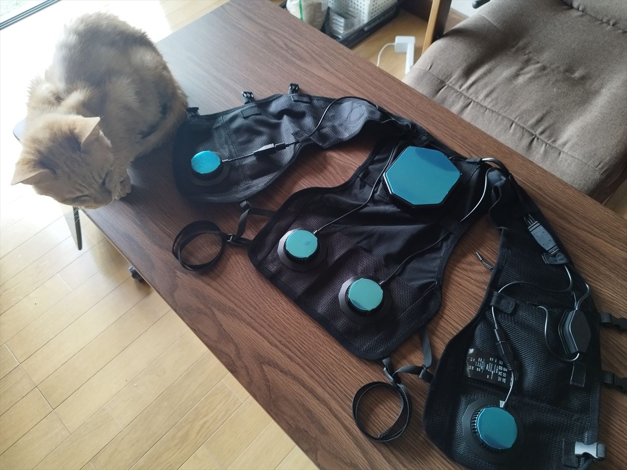 ベストの穴にデバイスをはめ込んで、ケーブルを面ファスナーで固定していく。