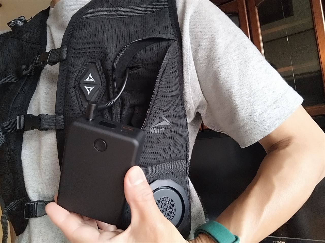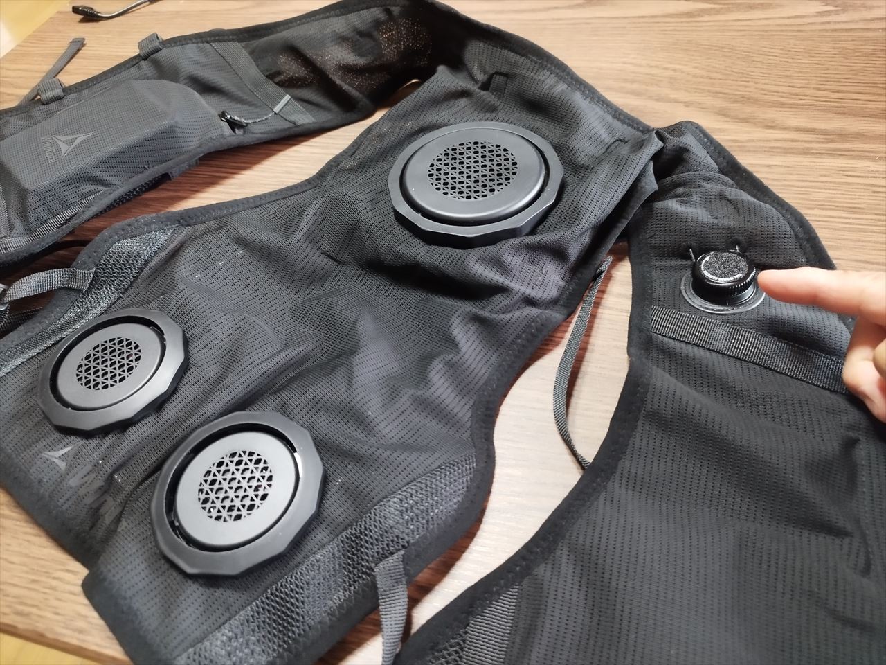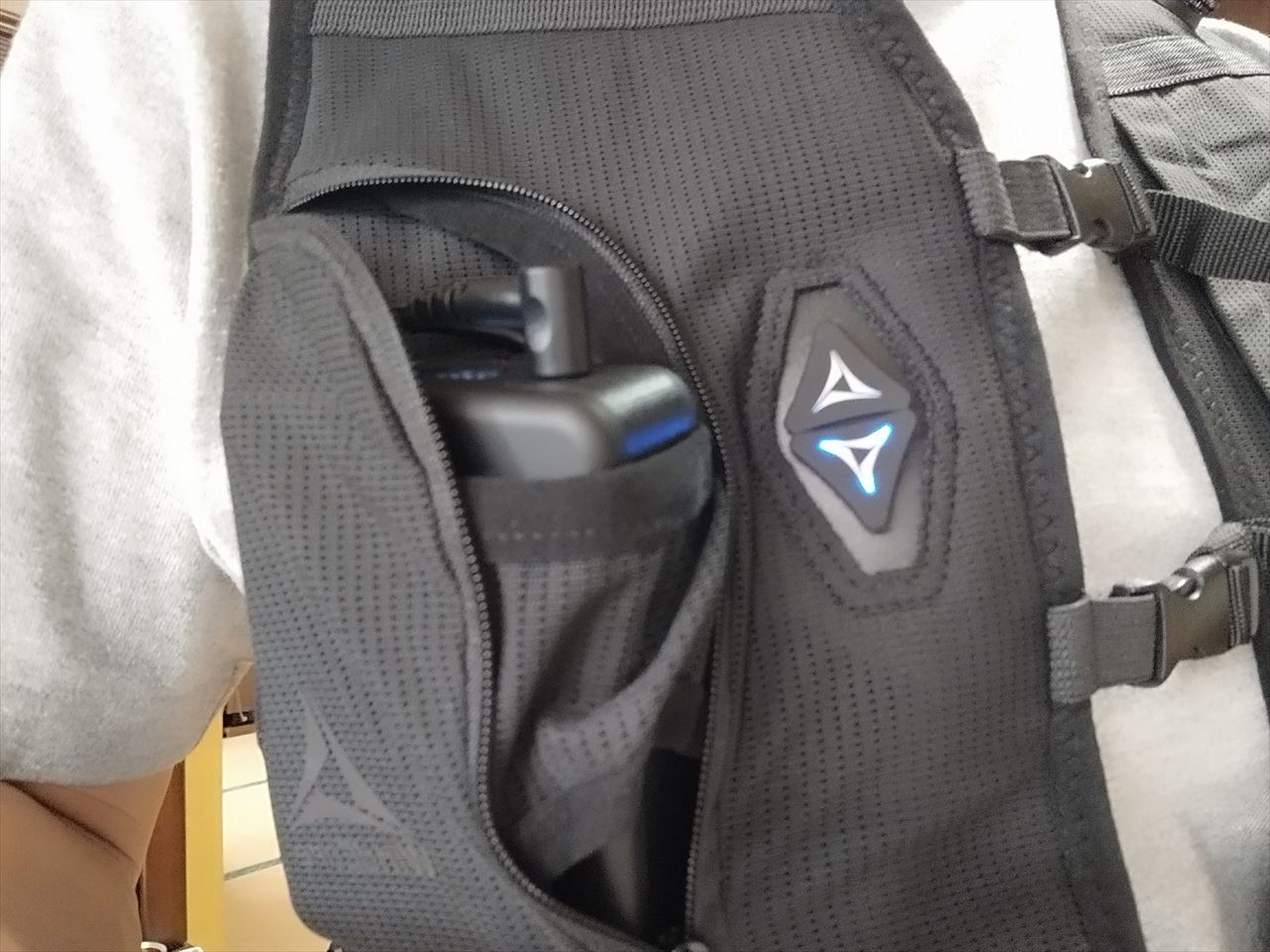 左の胸にメッシュポケットがついていて、そこがバッテリーの定位置だ。