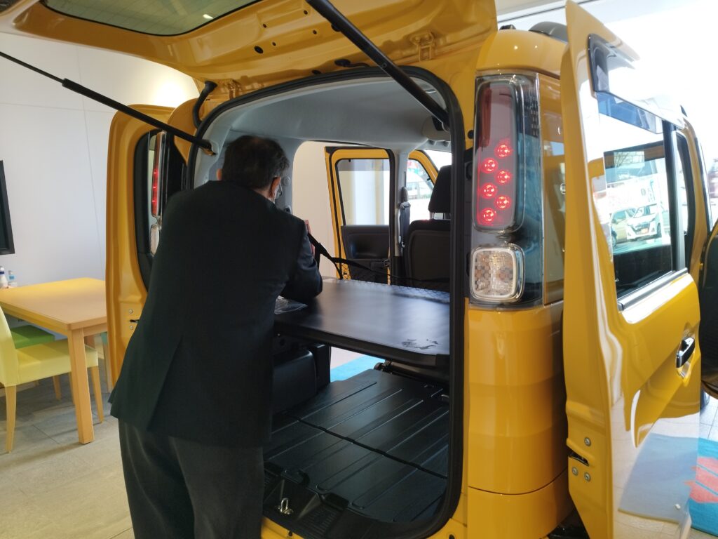 店内で書類のやりとりなどした後、担当の方が、マルチボードの高さ変更方法とか、荷室の床をフラットにするアレンジとか、あとディーラーオプションでつけたものの説明などをしてくれました。