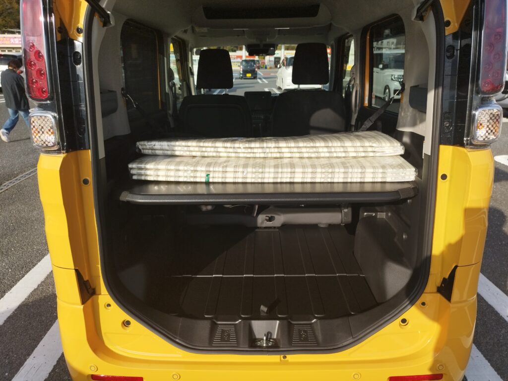 運転席・助手席はそのままで、荷室の床を完全フラットにして、斜めにマットレスを敷いて寝ました。156cmの自分だとそれでも足を伸ばして寝られるのです。