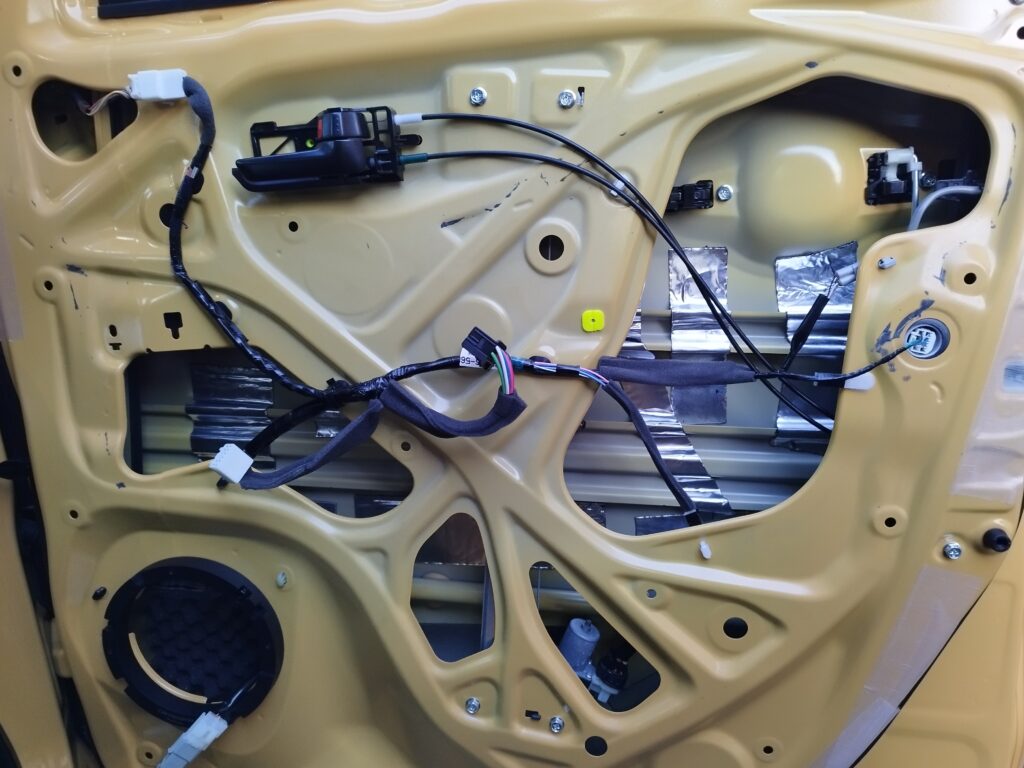 スピーカーのケーブルの接点はスポンジシートやエーモンの布テープのようなもので巻きとめ、さらに束ねてぐるり。この状態でドアの内側に結束バンドで固定しました。