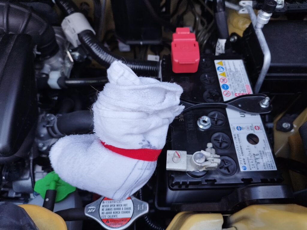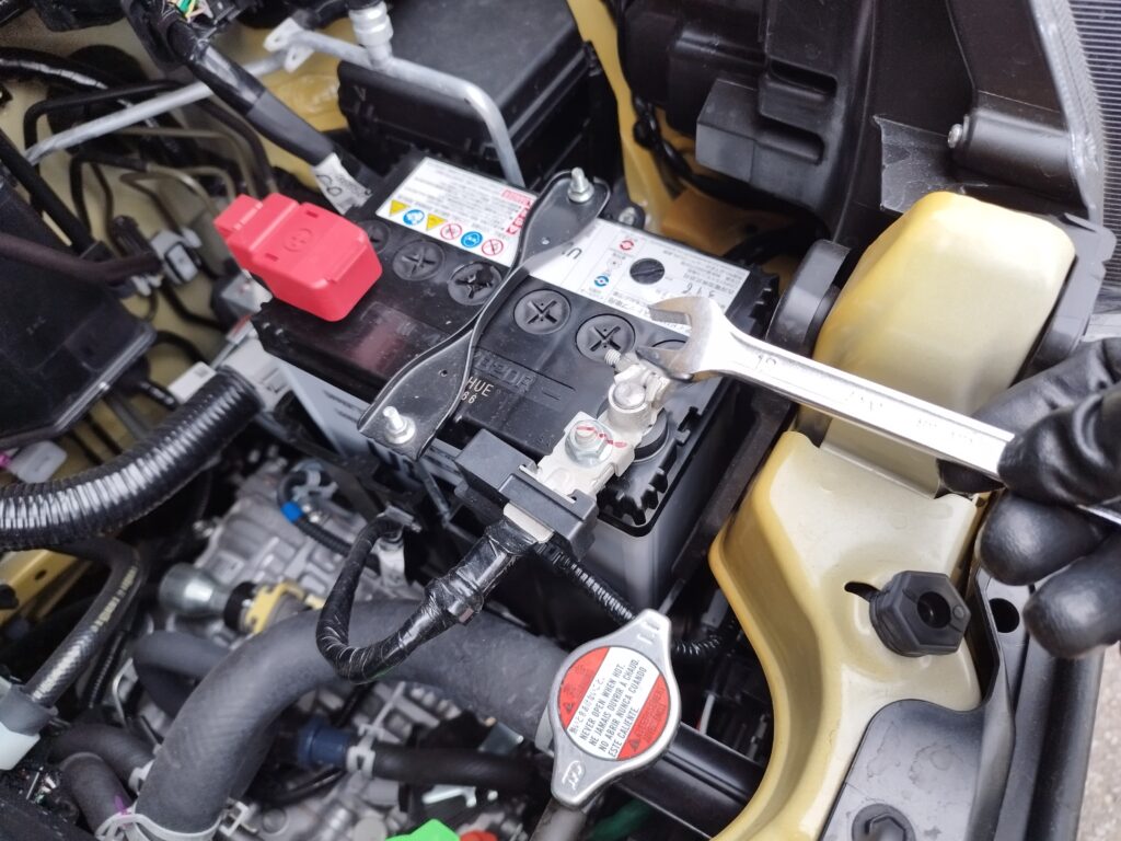 まずは、車のバッテリーのマイナス端子を外す作業。これ、小型バイクのバッテリー交換ではやったことがあるものの、車のバッテリーがどこにあるのかもわからなきゃ外すのも初めてなのでかなりドキドキでしたが、YouTube動画を参考に無事できました。