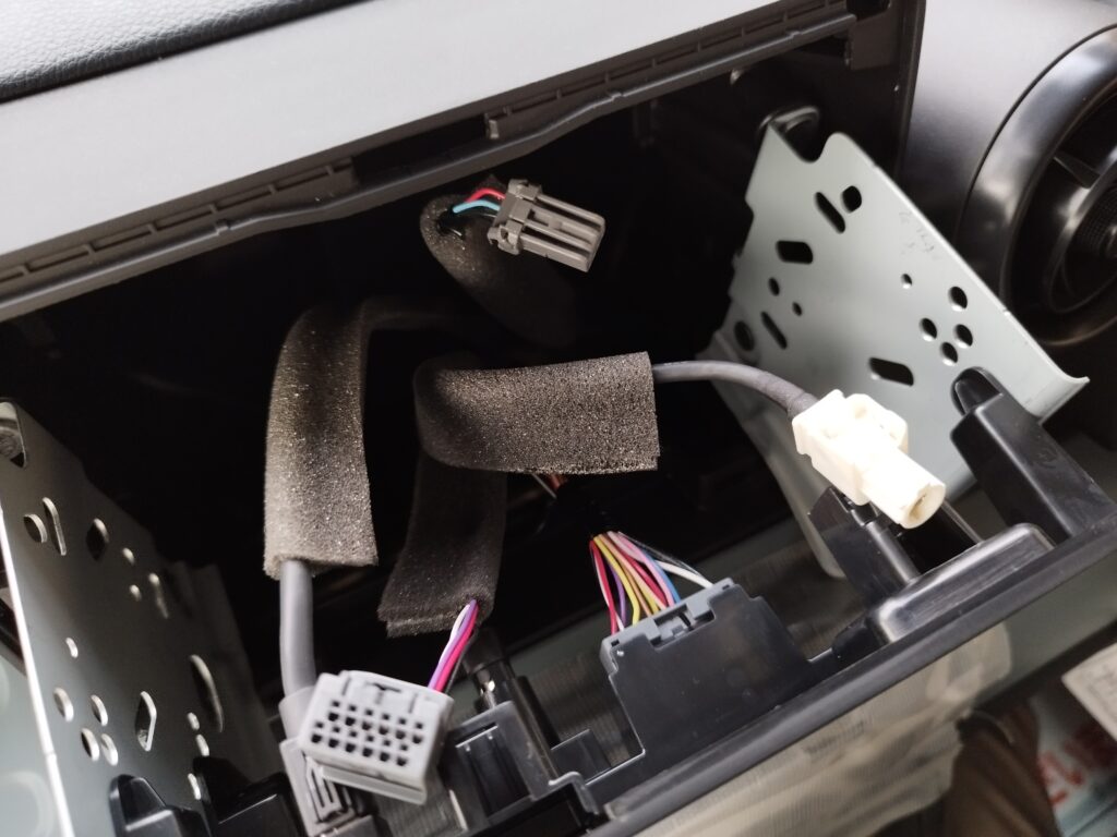 この後、配線を適当に束ねて、裏でゆさゆさしないようにまとめて、全部本体の裏に突っ込み、本体を取り付けます。カーナビと違い本体のサイズもかなり小さいので、裏も余裕があってそれほど大変ではありませんでした。
