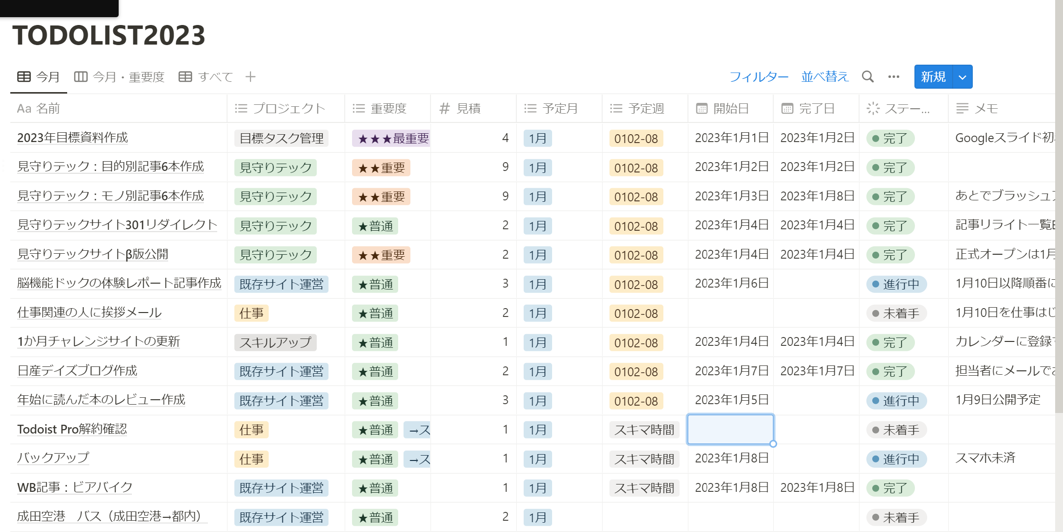 具体的にはひとつ2~3時間くらいで終わるものを週間10個。月間では30個ほど。そしてNotionのTODOLISTの「予定月」「予定週」の項目を使って割当てていく。