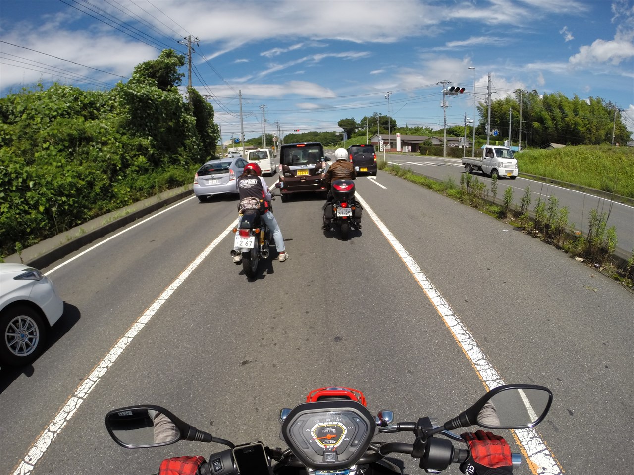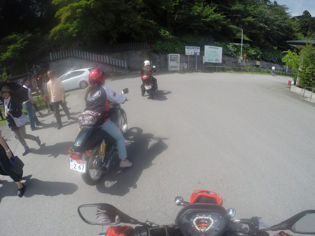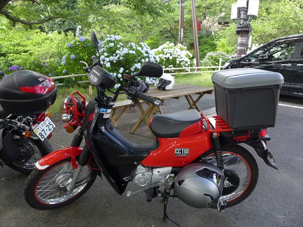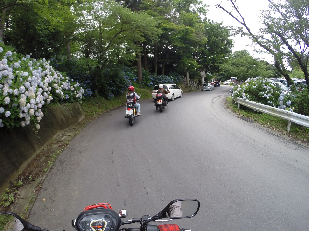バイクショップ合同ツーリングで知り合った女性の方に誘ってもらい、女性ライダー3人で茨城中部の雨引観音へあじさいを見に。ライダーズショップ小見川に集合すると、既にバイクショップ社長さんとルート相談をしていた。自分が馬力少なすぎスピード的にもあまり出せないかなと思ったので、途中はソロで走って目的地で合流すればいいやと思っていたんだけど、「60キロは出せるでしょ?だったら大丈夫」と言われ、ずっと最後まで一緒に走らせてもらった。自分が遅れてしまわないよう65キロ以内におさえて走ってくれたそう。