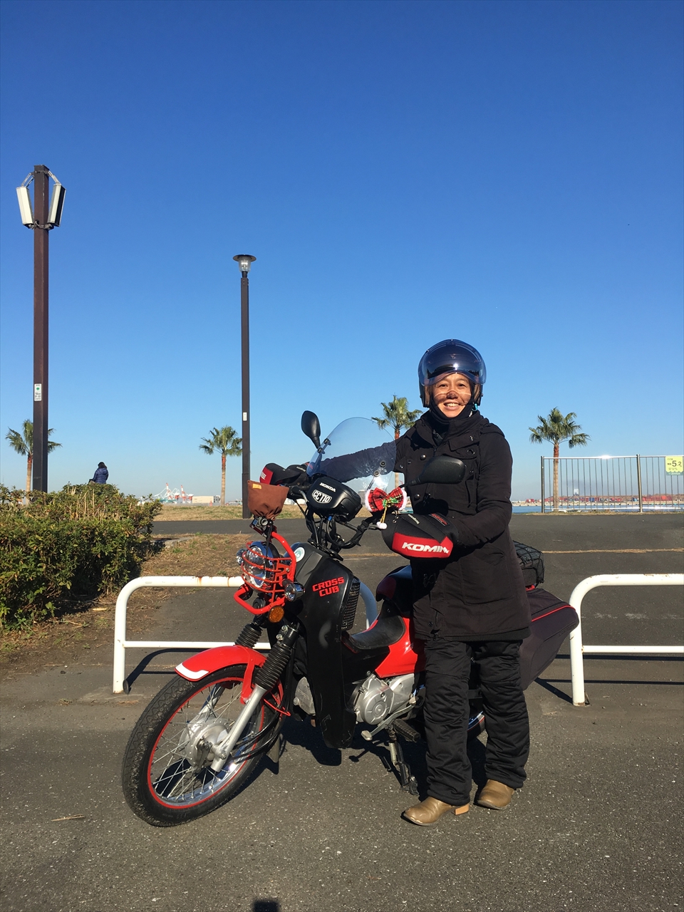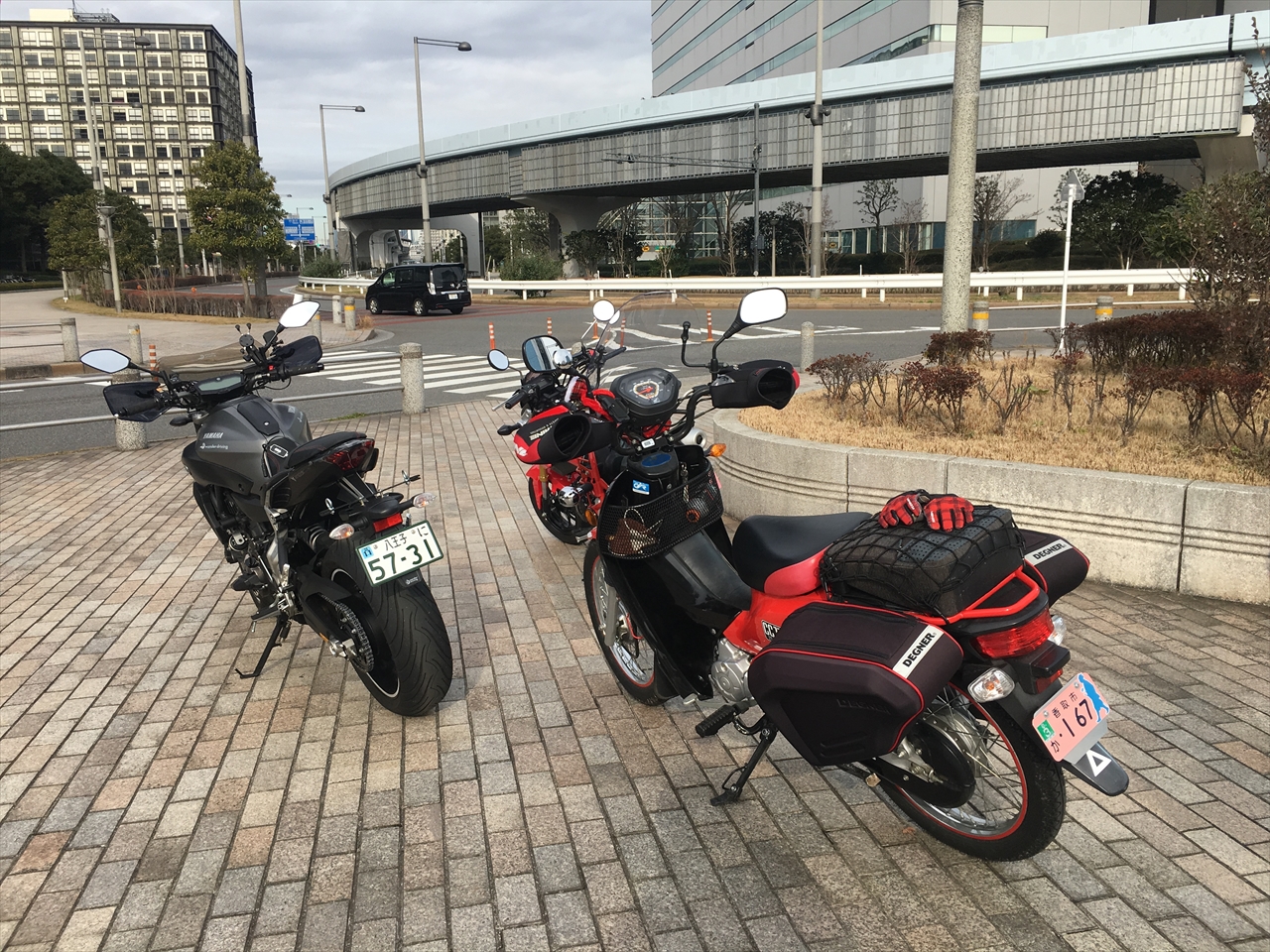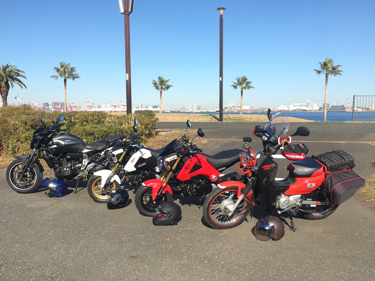 ゲートブリッジを眺めながらしばしのんびり。そこにもうひとりSさんが合流。ホンダの125cc「グロム」が赤白2台となった。どちらもお台場のレンタルバイクショップで借りたもの。