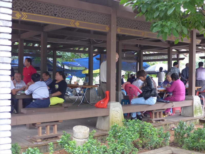 「文昌閣」という壁が一面しかない建物が人でにぎわっているのでお茶飲める場所かと思って近づいたら、年配の人達が麻雀やら将棋やらで盛り上がっていた。