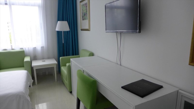 ホテルの部屋は、白と若草色を基調にした明るいテイスト。
