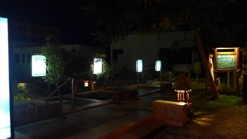 温泉は夕方16時半から23時までなんだけど、温泉エリアのスタッフ女性に聞いたところ「先に食事して18時過ぎにきたほうがいい」とのことだったので、暗くなってからやってきた。