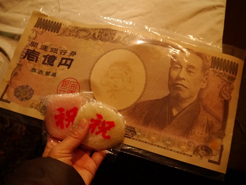 参拝終えた人には、紅白のやわらかいお餅と「巨大な一億円札」が渡された。商売繁盛のお守りらしい。