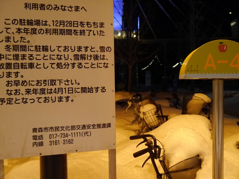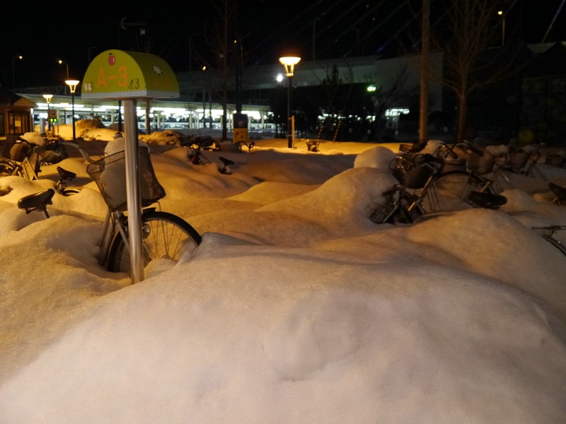 青森駅の自転車置き場は雪の中