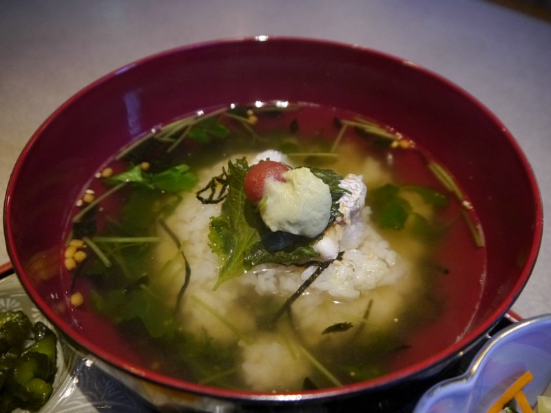 ちょっとわかりにくいかもしれないけど、中央に炙った鯛があり、その上に青ジソと梅干、わさびが乗っている。実際には割と大きめの塊の鯛が入っていた(シソに隠れちゃってるけど)。