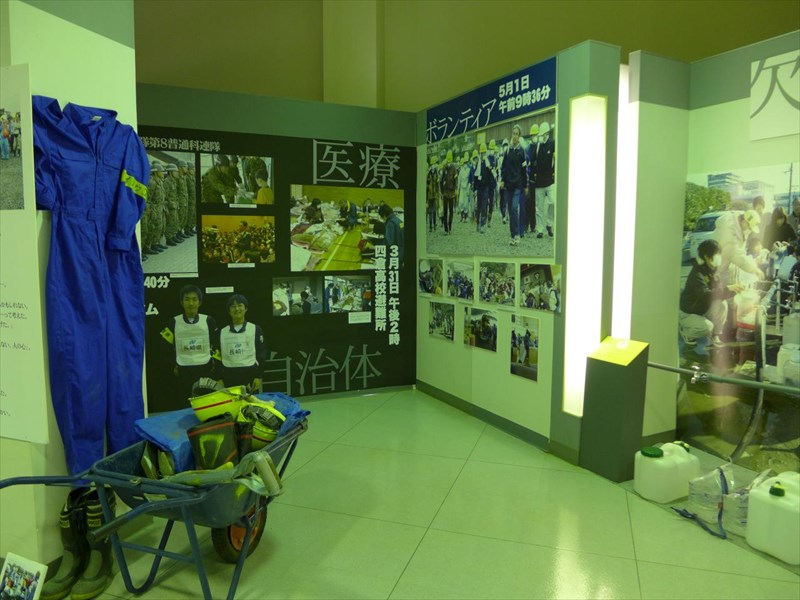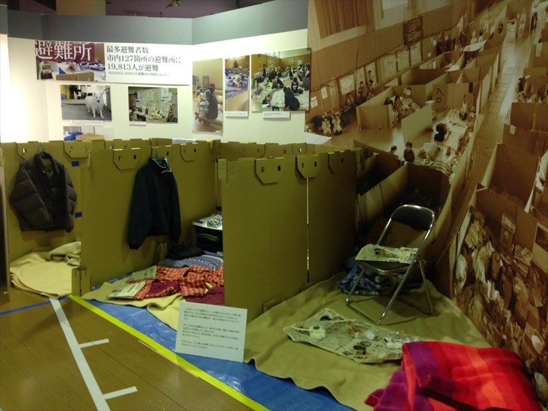 市内127カ所に設置された避難所には、最も多い時で2万人弱の人達が避難していたという。ブルーシートの上に毛布が敷かれた避難所の様子が展示されていた。